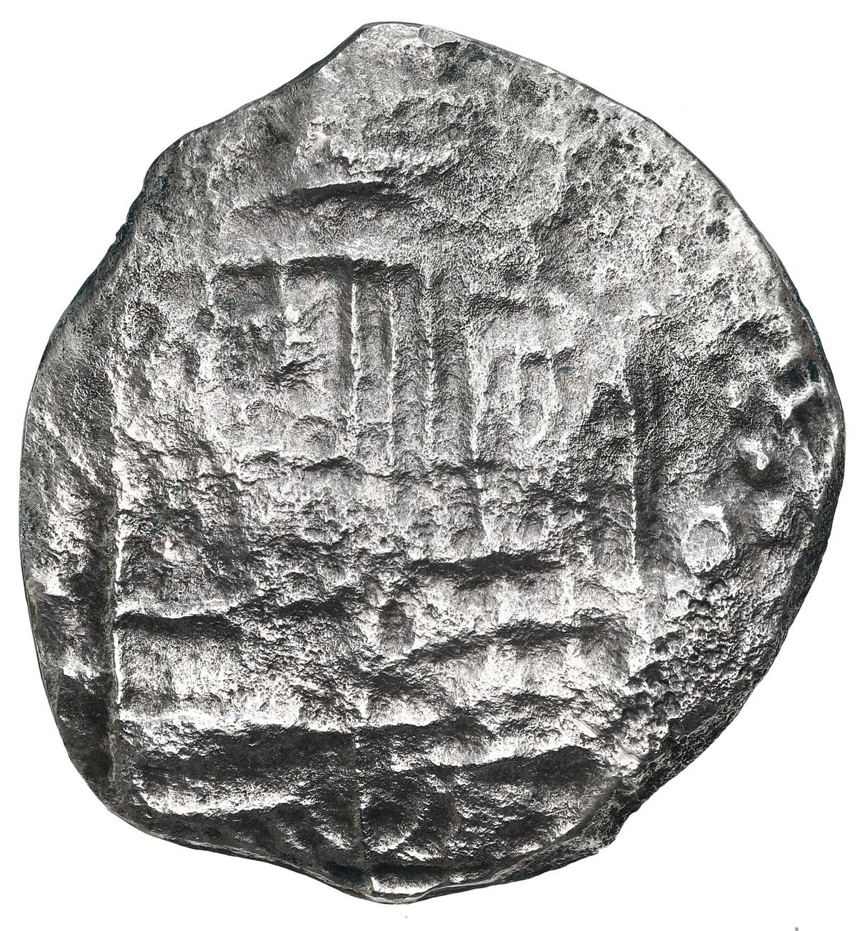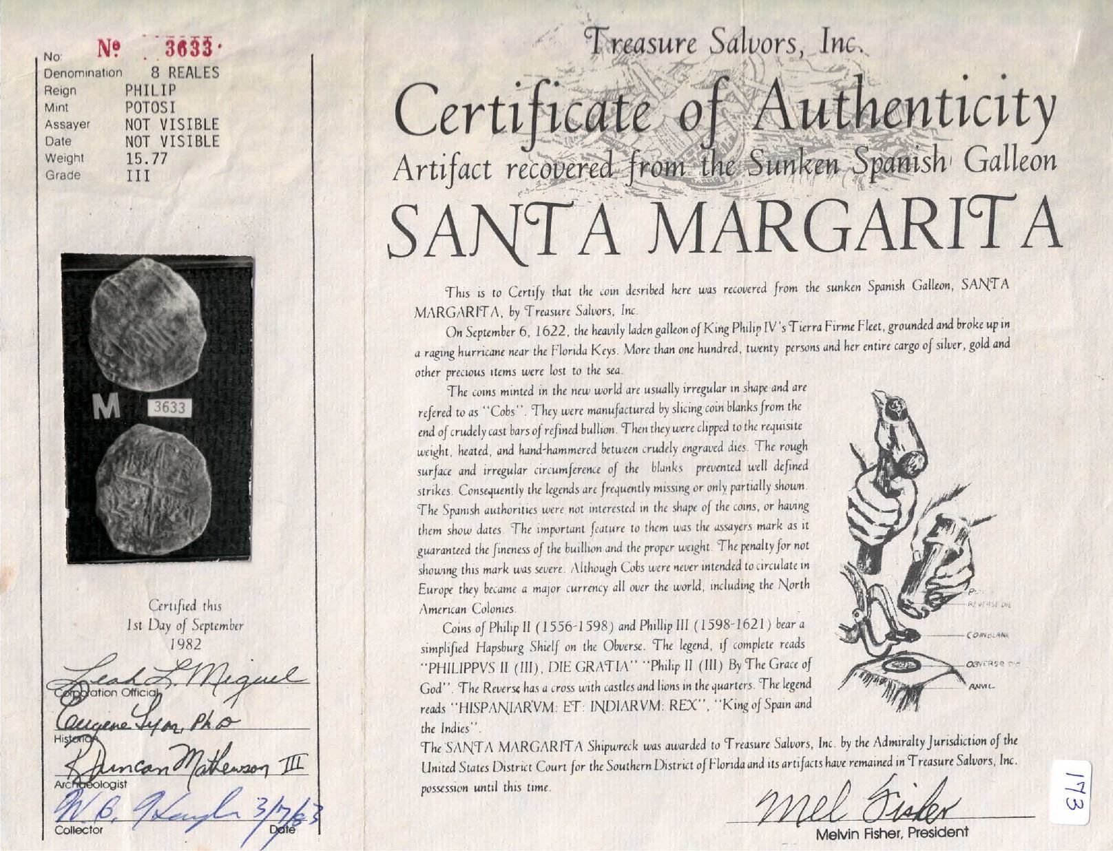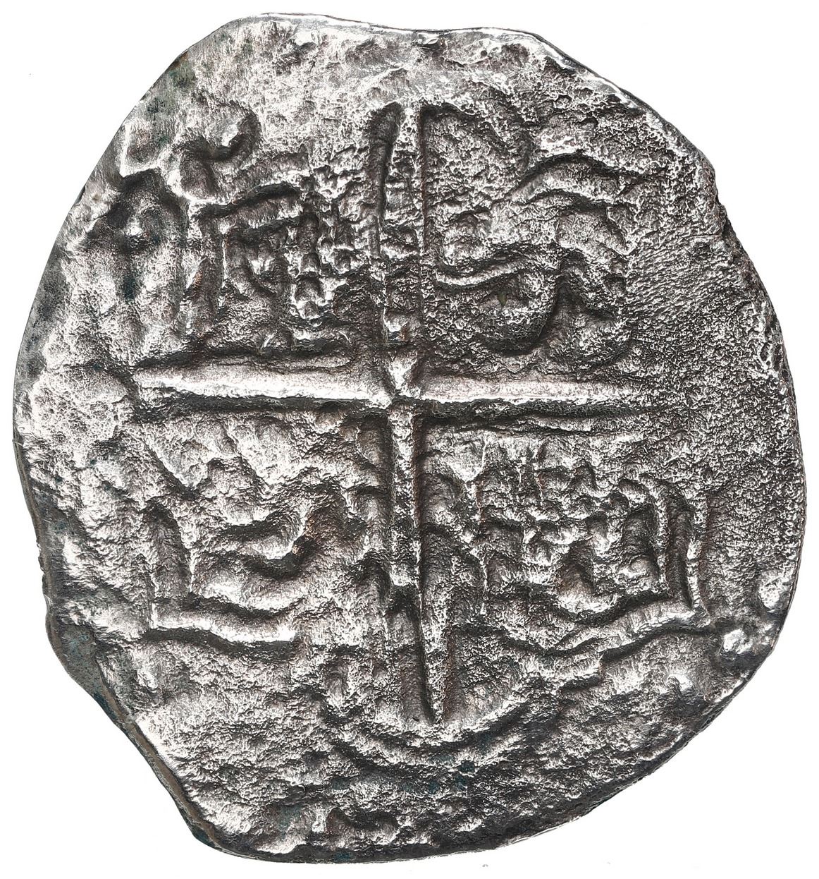 Potosi, Bolivia, cob 8 reales, Philip III, assayer not visible, Grade 3. KM-10. 15.78 grams. Somewhat thin from corrosion but still with bold full shield and cross, silvery with toning in crevices. With original Fisher tag and photo-certificate 3633 from 1982. From: Santa Margarita, sunk in 1622 west of Key West, Florida
