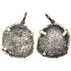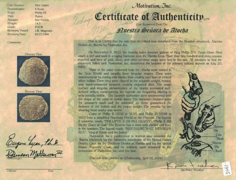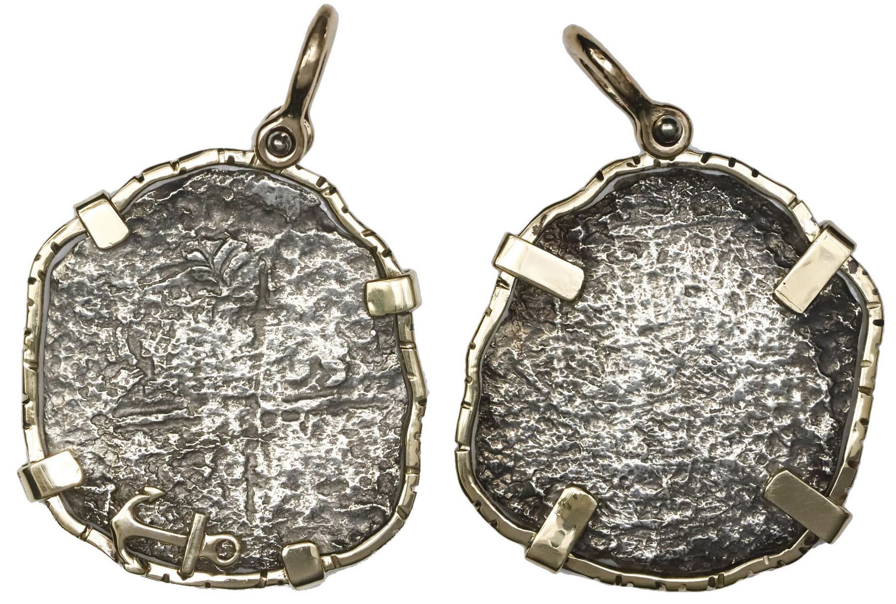 Potosi, Bolivia, cob 8 reales, Philip III, assayer not visible, Grade 4, ex-Atocha (1622), mounted cross-side out in rustic 14K gold bezel with anchor ornament at bottom and shackle bail. 21.21 grams total. Heavily corroded coin but with some shield and cross visible, simple flat prongs. From the Atocha (1622), with Fisher photo-certificate #99A-56866.