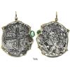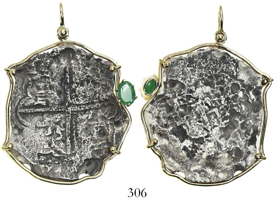 Potosi, Bolivia, cob 8 reales, Philip III, assayer not visible, Grade 4, mounted in gold-wire bezel with emerald. KM-10. 19.75 grams total. Decent cross despite moderate to heavy corrosion (the shield indiscernible), simple custom mounting with decent-sized (1 carat?) emerald with modern faceting. With Fisher certificate #228726. Recovered from: Atocha, sunk in 1622 west of Key West, Florida