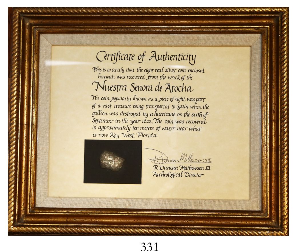 Potosi, Bolivia, cob 8 reales, Philip III, assayer not visible, Grade unknown, custom-framed with Duncan Mathewson certificate. KM-10. About 14" x 12". Dark and corroded coin (parts of edge missing) but with clear cross showing, attractively mounted, the custom certificate unique (first of its kind we have ever seen). Housed in a framed display with a hand-signed certificate from Fisher archeologist R. Duncan Mathewson III. Recovered from: Atocha, sunk in 1622 west of Key West, Florida