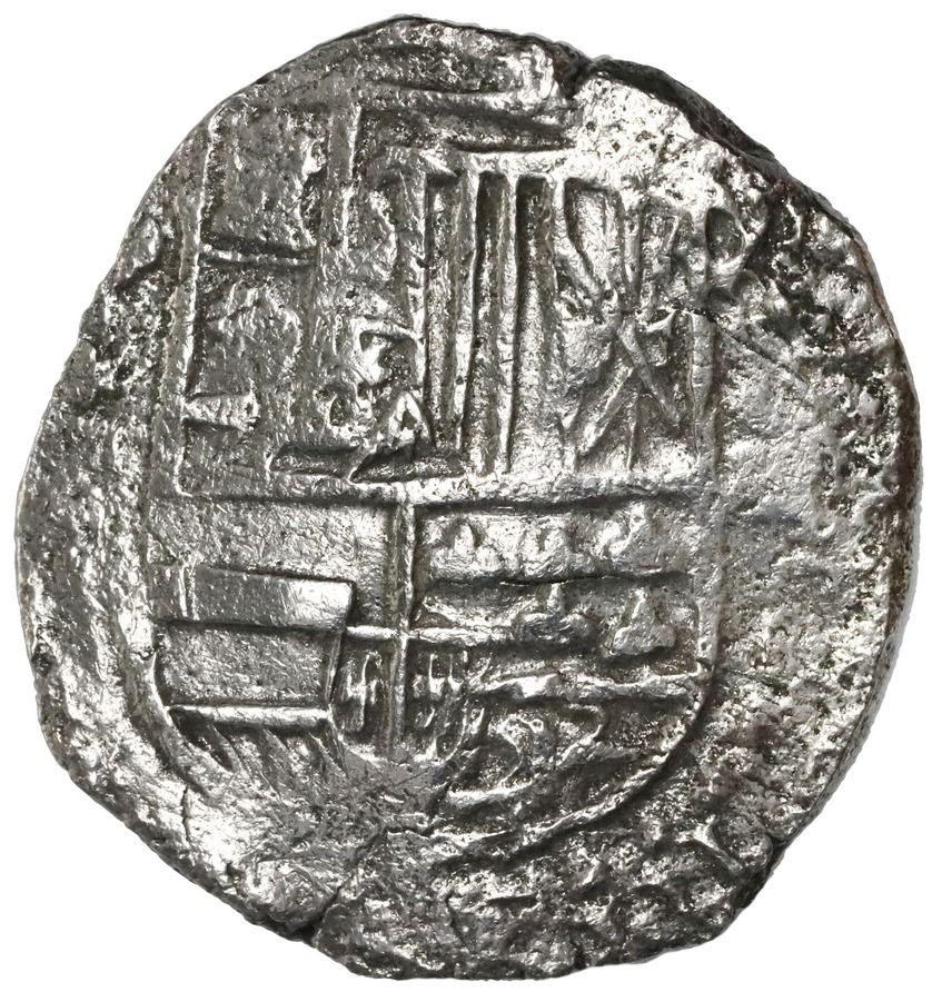 Potosi, Bolivia, cob 8 reales, Philip III, assayer not visible, no Grade on certificate (Grade-1 quality). KM-10. 25.69 grams. Choice full shield and cross, minimal surface corrosion, slightly silvery. With Fisher tag and photo-certificate #116189. Recovered from: Atocha, sunk in 1622 west of Key West, Florida
