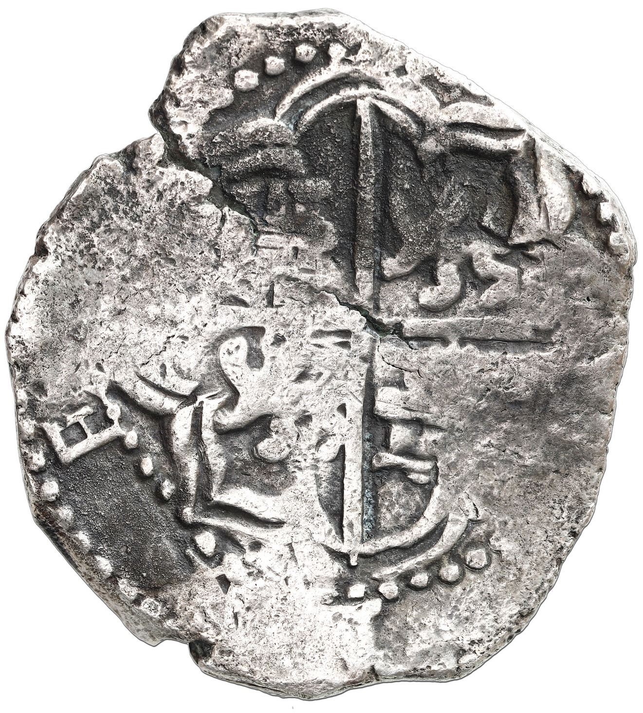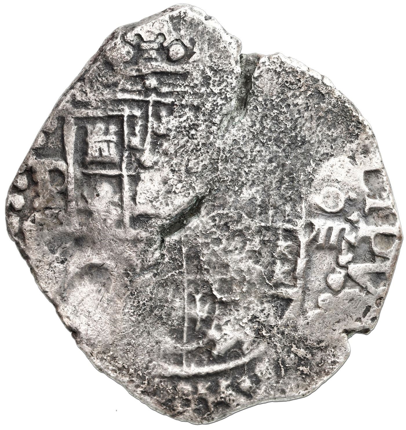 Potosi, Bolivia, cob 8 reales, Philip III, assayer not visible, no Grade on certificate. KM-10. 25.36 grams. Full but crude cross and shield, full denomination o-VIII inside bold king's name (PHY)LYPVS, minimal corrosion except for a couple of long, thin, green-filled pits and some areas of dark oxidation, edge-crack. With Fisher tag and photo-certificate 85A-119074.Recovered from: Atocha, sunk in 1622 west of Key West, Florida.