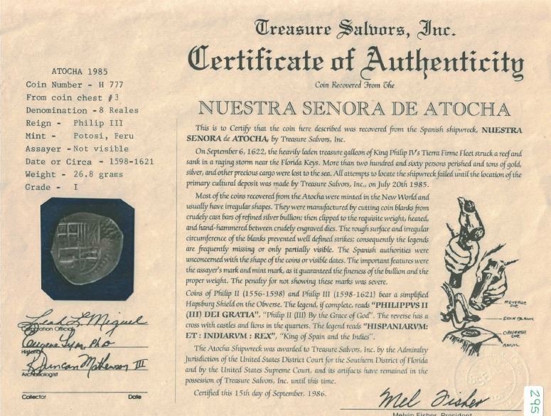 *** NOTE: Any stated "replacement" certificates are not authorized by Mel Fisher's Treasures. Any stated "Fisher tags" refer to printed insert cards (usually barcoded) and not original plastic tags. Any stated "Grade quality" in conflict with the Grade in the Fisher database or on a Fisher certificate is given as our own opinion about quality and does not imply that Mel Fisher's Treasures will or should upgrade the coin to that Grade. By ruling of the United States District Court for the Southern District of Florida in Admiralty, Mel Fisher's Treasures is the only entity authorized to (1) authenticate that a coin has been recovered from the Atocha, and (2) assign Grades to coins recovered from the Atocha. ***