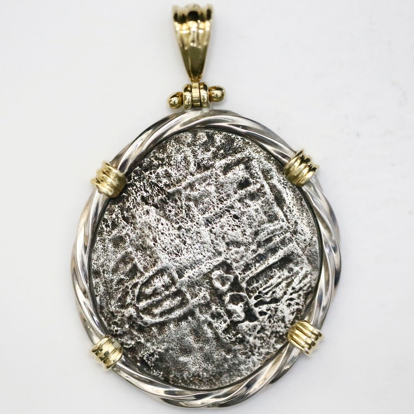 Potosi, Bolivia, cob 8 reales, Philip III, assayer not visible, quadrants of cross transposed, Grade 3, from the Atocha (1622), tag and certificate missing, mounted cross-side out in rope-style silver bezel with 14K gold prongs and shackle bail. 26.21 grams total. Partial cross and shield, some areas weak from corrosion, dark toning in recessed areas. From the Atocha (1622), Fisher database #99A-56911.