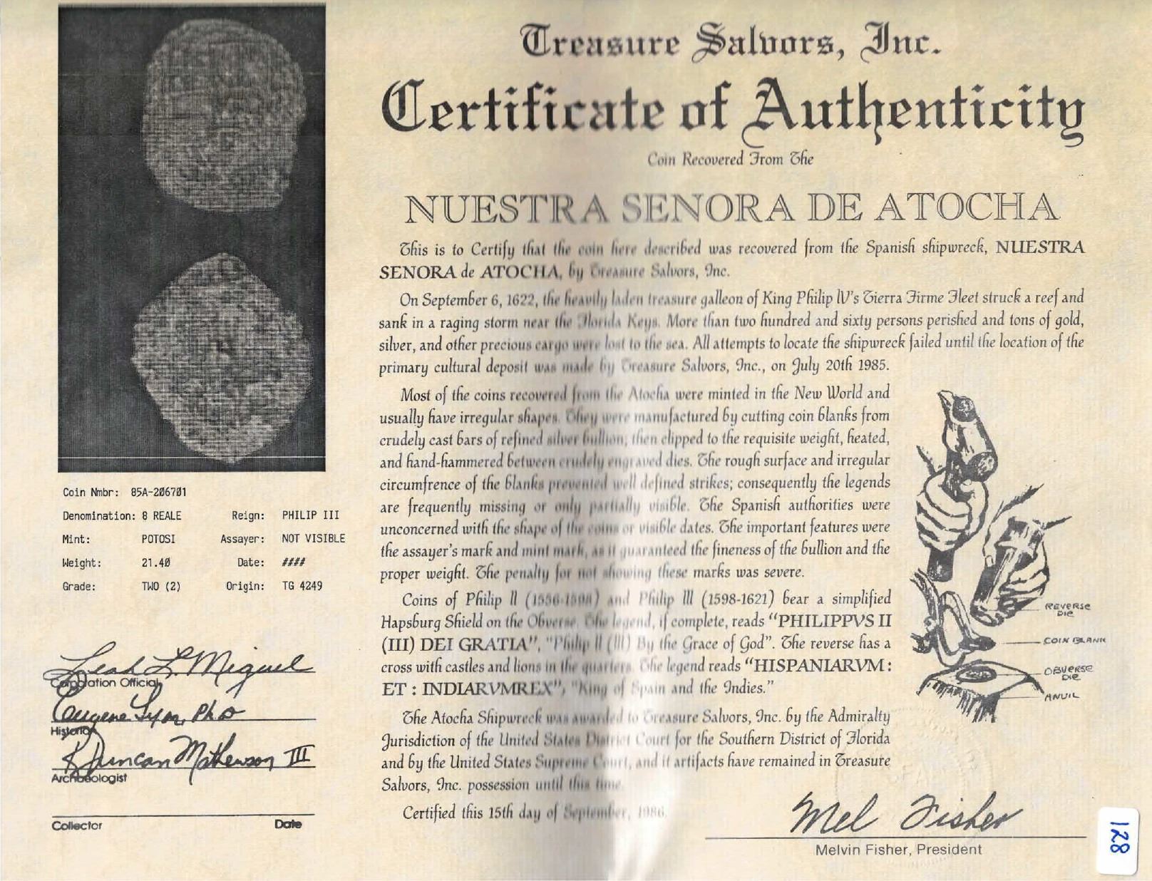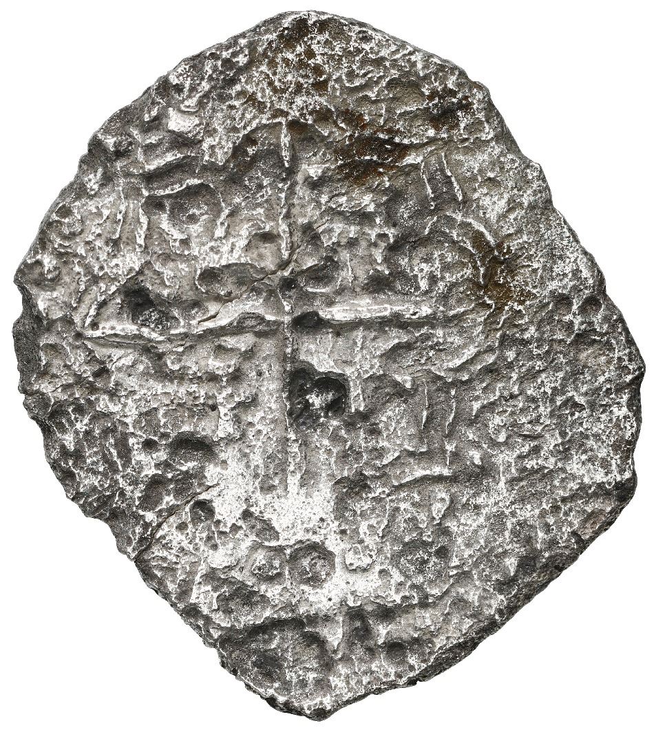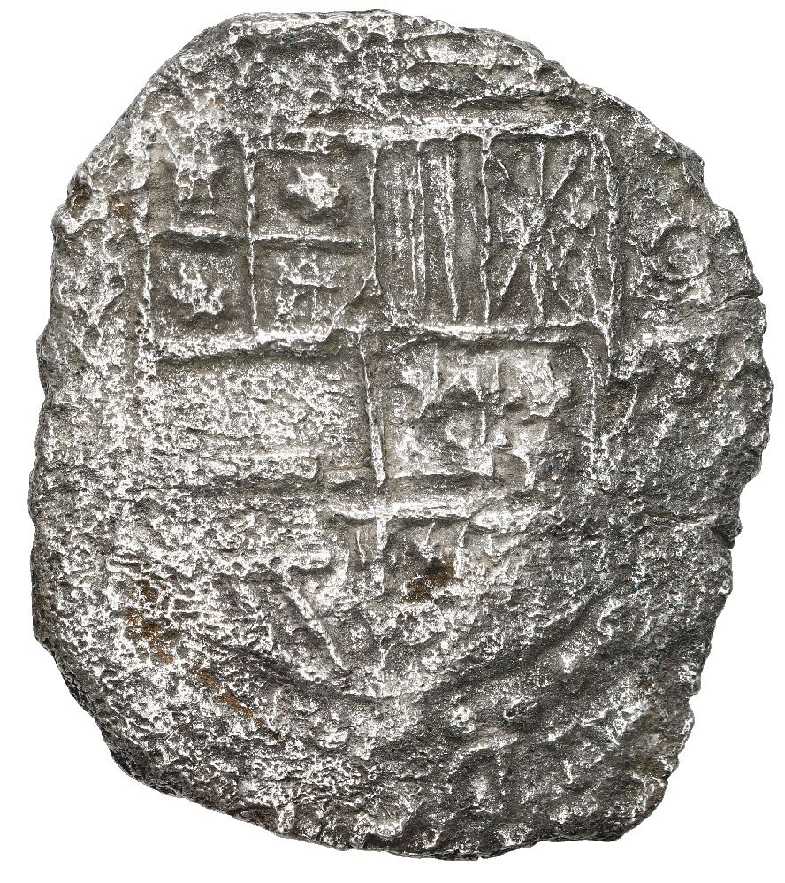 Potosi, Bolivia, cob 8 reales, Philip III, assayer not visible, quadrants of cross transposed, Grade 2. KM-10; Cal-Type 165. 21.60 grams. Good full shield, full but pitted cross, moderately corroded all over. With Fisher certificate 206701. Recovered from: Atocha, sunk in 1622 west of Key West, Florida