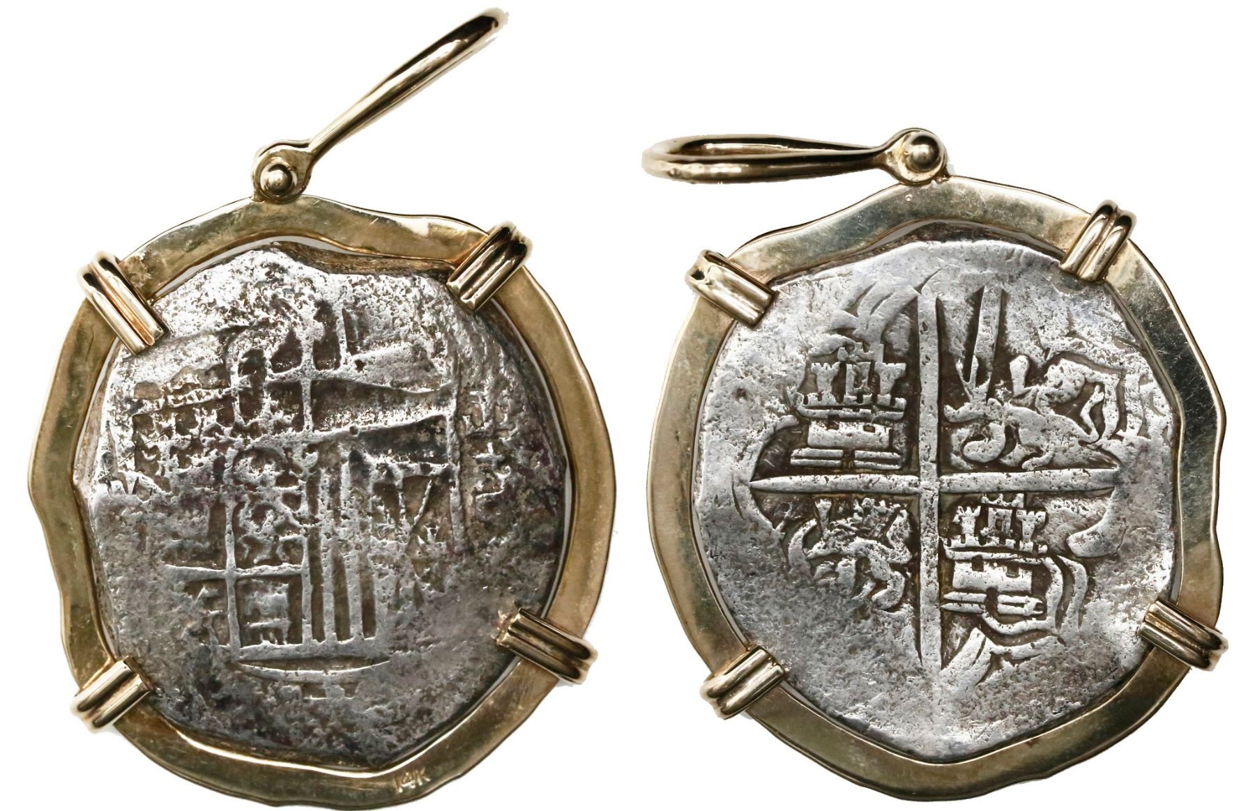 Potosi, Bolivia, cob 8 reales, Philip III, upper half of shield transposed, assayer T, Grade 1, mounted in 14K pendant-bezel. S-P21; KM-10. 33.54 grams total. Choice full cross (slightly doubled at top left), full but lightly corroded shield, nicely oriented on the same axis (coin alignment, meaning the shield is upside-down in the mounting), with nicely contrasting toning in crevices, extra-wide shackle bale for wearing on thick chain. With Fisher tag and Sinclair photo-certificate #85A-212925, pedigreed to our Auction #11, with original lot-tag #248. Recovered from: Atocha, sunk in 1622 west of Key West, Florida