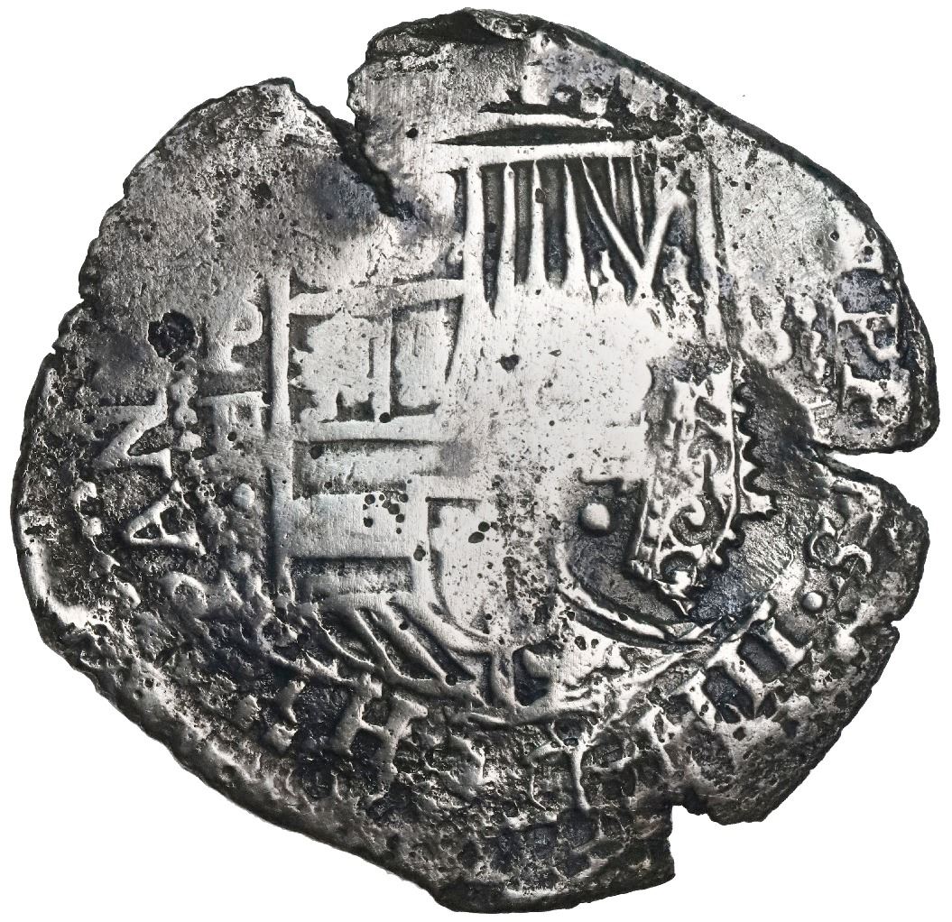 Potosi, Bolivia, cob 8 reales, Philip IV, assayer E (1651-2), with two countermarks (very rare): crowned-dot-F-dot countermark (two dots) on shield and crowned-L on cross. S-P36; KM-19b; Cal-Type 327. 22.67 grams. Broad flan with patchy toning and corrosion near edge, both countermarks fairly bold (full crown above weak dot-F-dot on obverse), king's ordinal IIII, clear P-E to left and 8 to right, small edge-splits. From: Capitana, sunk in 1654 off Chanduy, Ecuador