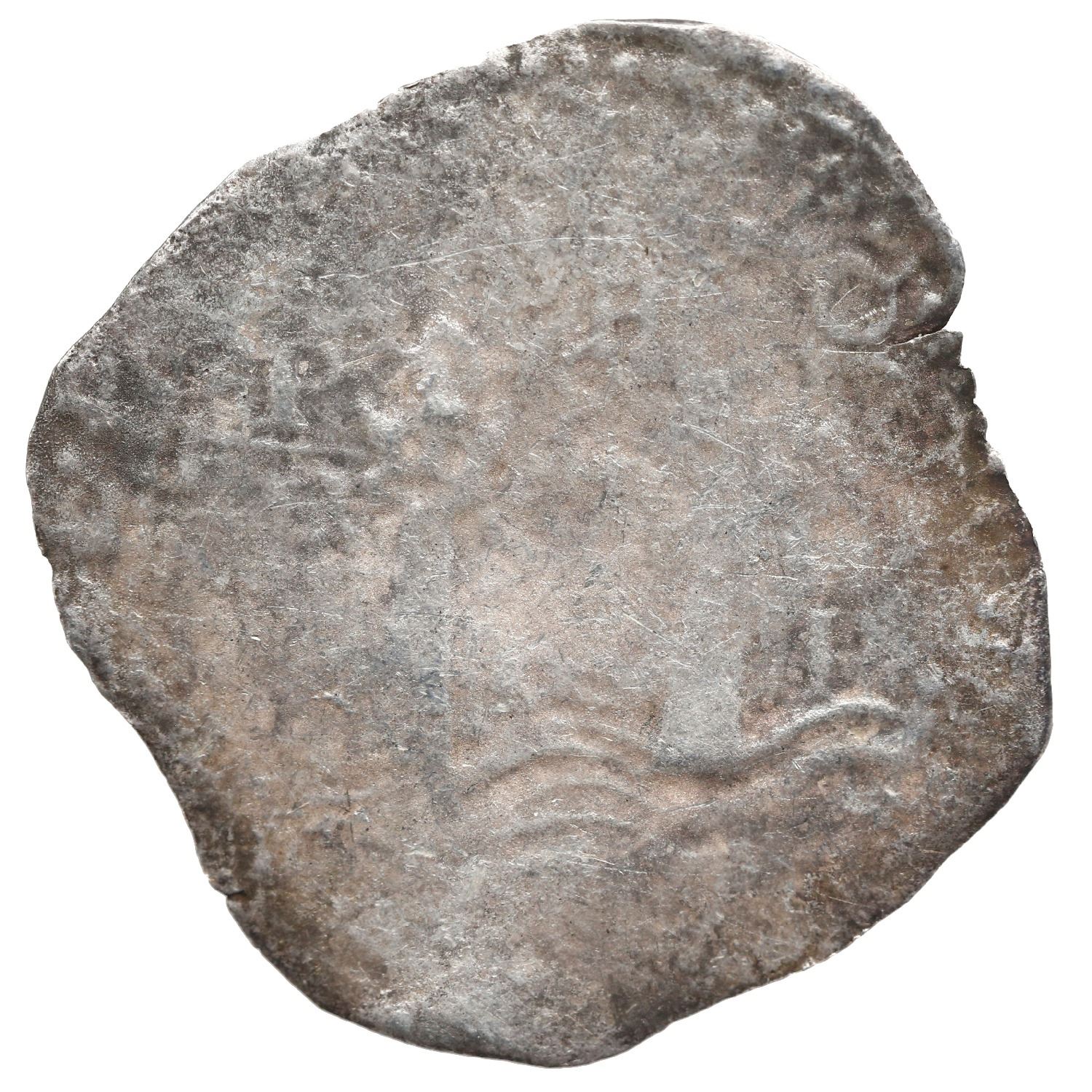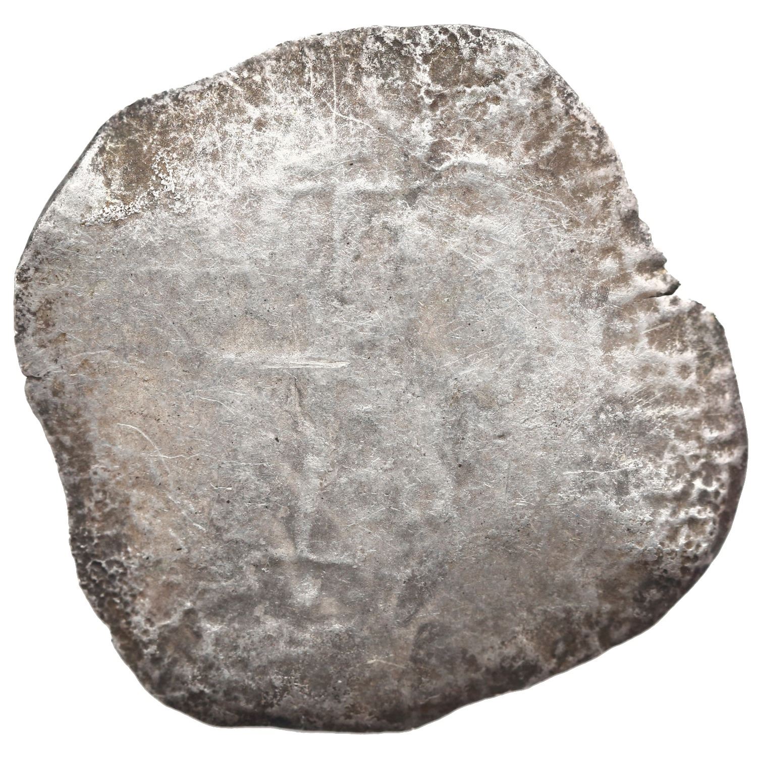 Potosi, Bolivia, cob 8 reales, Philip IV, assayer E (1652-3), with 1-PH-6 at top. S-P37a; KM-21. 12.20 grams. Very thin but with some pillars-side detail including 1-PH-6 across top. Recovered from: Capitana, sunk in 1654 off Chanduy, Ecuador
