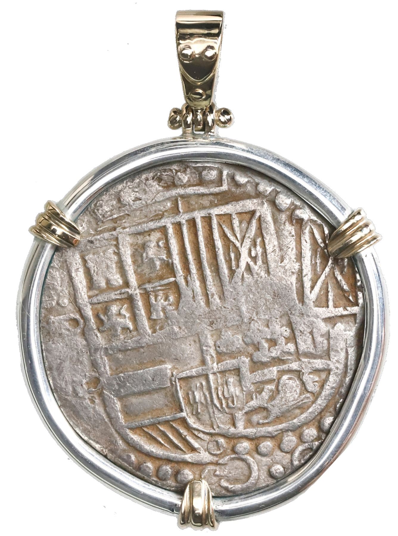 Potosi, Bolivia, cob 8 reales, Philip IV, assayer P (1620s), ex-Panama hoard (ca. 1629), mounted cross-side out in thick silver bezel with 14K gold prongs and shackle bail. 38.99 grams total. Full cross (mounted upside-down) and choice full shield (both slightly doubled), VF with much orange sediment in crevices, thick round mount (coin edge probably lightly shaved to fit). From the ca.-1629 "Panama hoard," with photo-certificate.