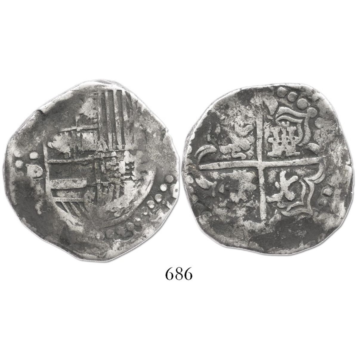Potosi, Bolivia, cob 8 reales, Philip IV, assayer .P (1620s), quadrants of cross transposed and lions rotated. S-P23; KM-19a. 27.1 grams. A bit worn (About Fine) and somewhat crudely toned but with bold assayer, full shield and cross, with lions tilted onto their tails (or possibly proper quadrants with sideways castles, which is actually less likely).