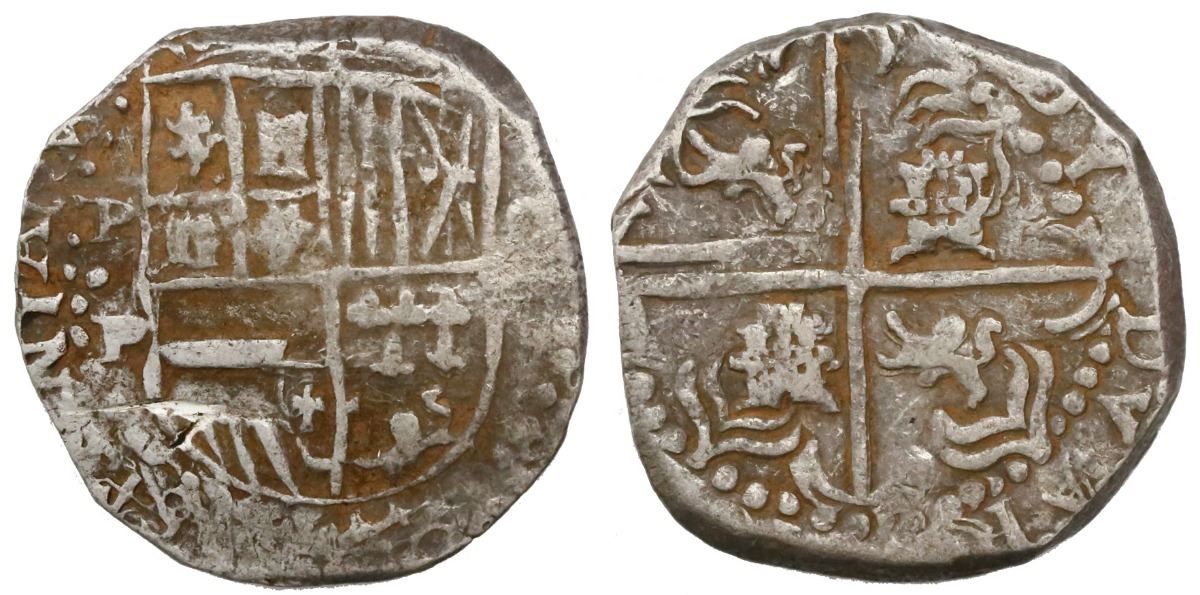 Potosi, Bolivia, cob 8 reales, Philip IV, assayer •P (1620s), quadrants of cross transposed, ex-Panama hoard. S-P22; KM-19. 26.50 grams. Bold full shield and cross (the latter slightly doubled), full P•P, fine with modern scratch on shield, loaded with orange sediment. From the 1629 "Panama hoard."