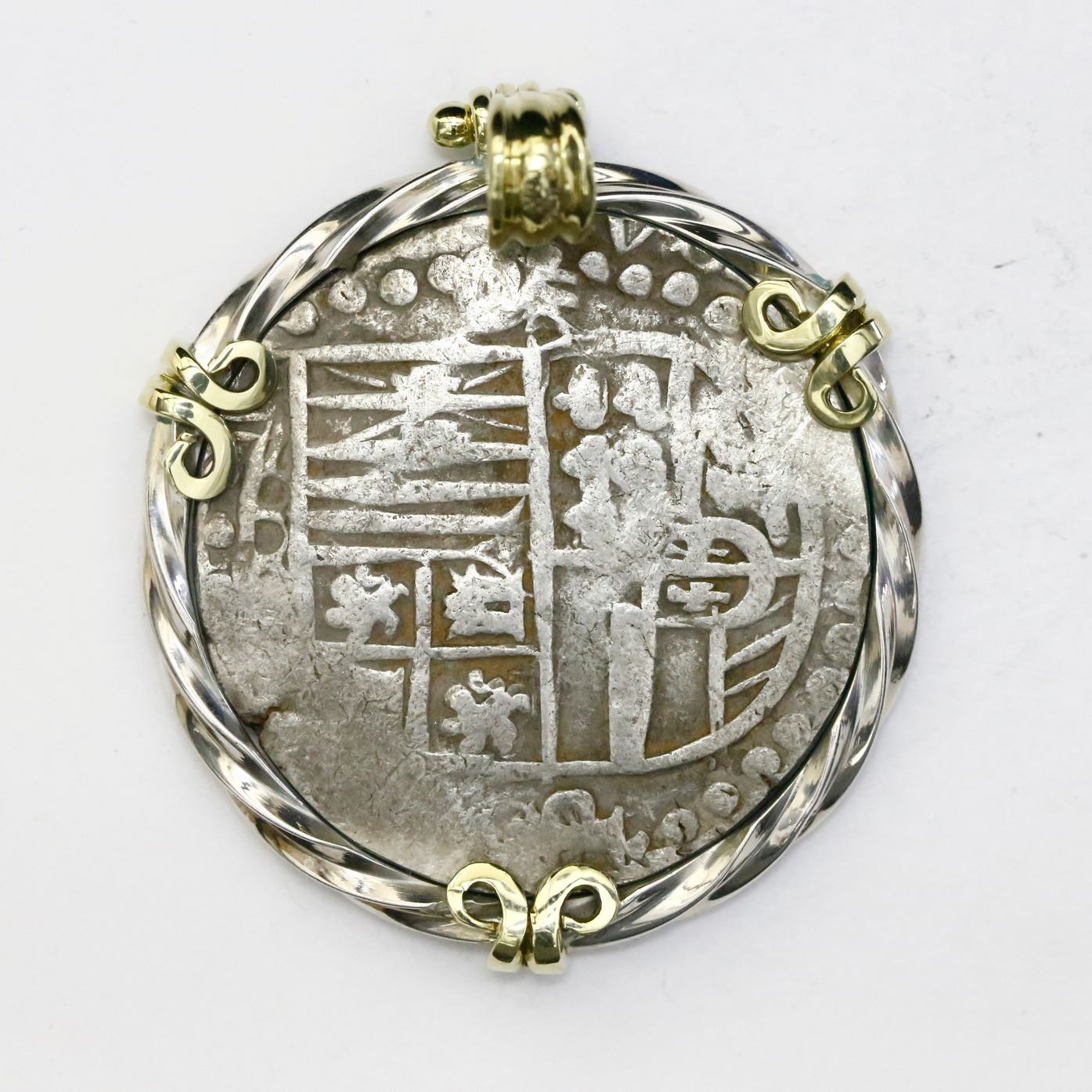 Potosi, Bolivia, cob 8 reales, Philip IV, assayer P, quadrants of cross transposed, ex-"Panama hoard," mounted cross-side out in rope-style silver bezel with 14K gold prongs and shackle bail. 38.00 grams total. Nearly complete cross and shield, clear assayer, reddish encrustation in crevices (typical from this hoard). From the ca.-1629 "Panama hoard," with photo-certificate.