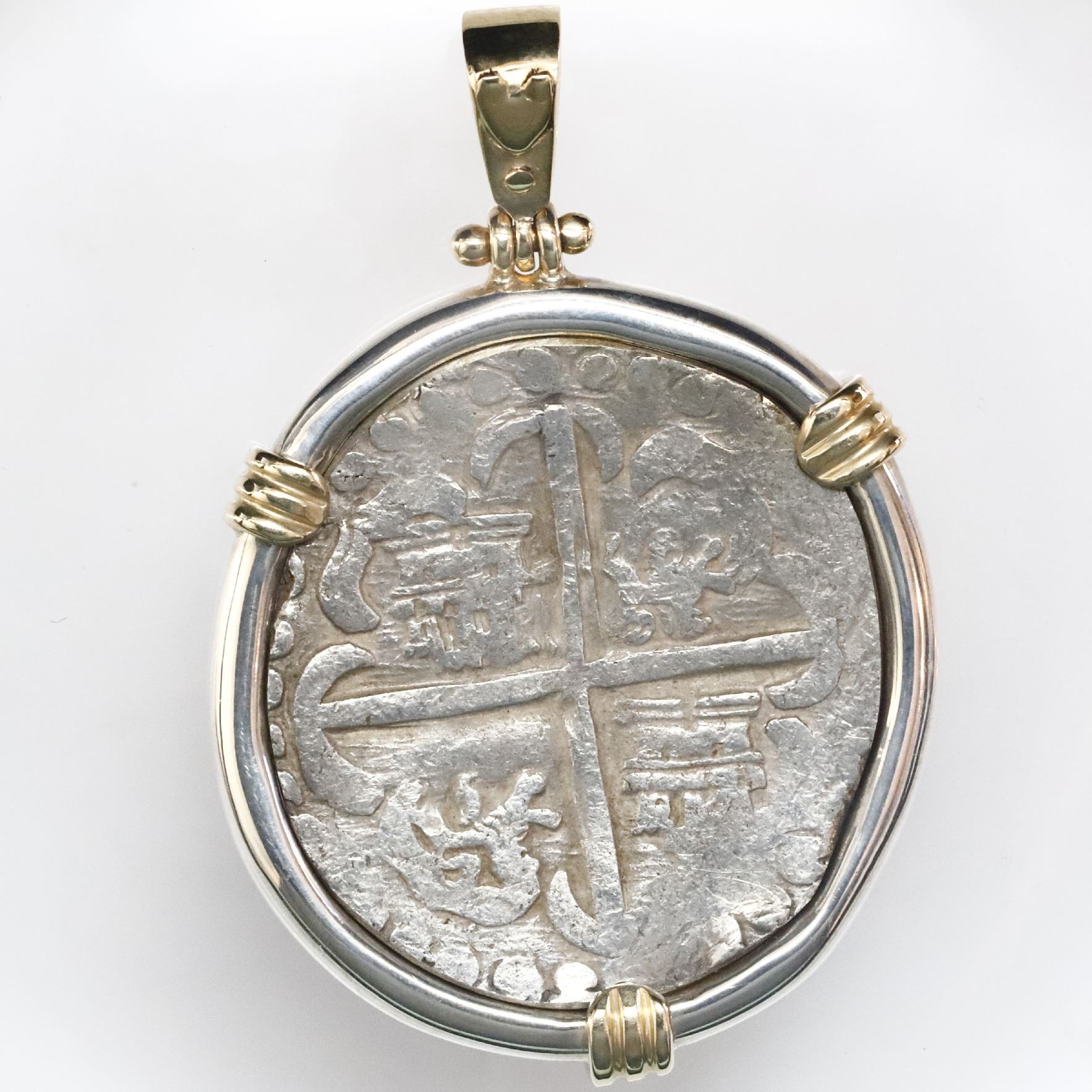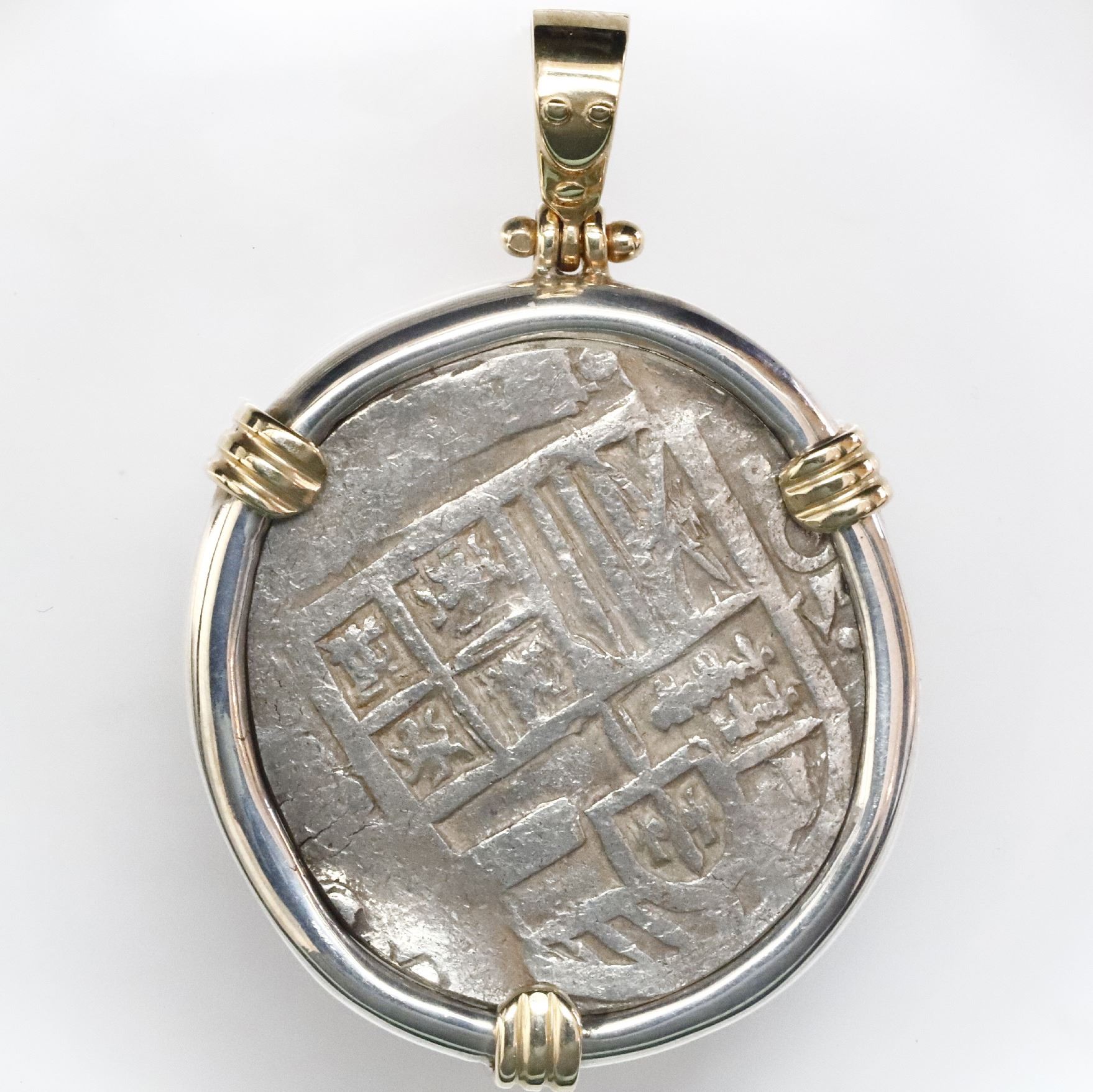 Potosi, Bolivia, cob 8 reales, Philip IV, assayer T (1620s), ex-Panama hoard (ca. 1629), mounted cross-side out in thick silver bezel with 14K gold prongs and shackle bail. 41.11 grams total. Thick and roundish flan (possibly lightly shaved on edge to fit the thick and sturdy bezel) with good full shield and cross (both slightly doubled, the latter also slightly off-center), VF+ with orange sediment on fields.