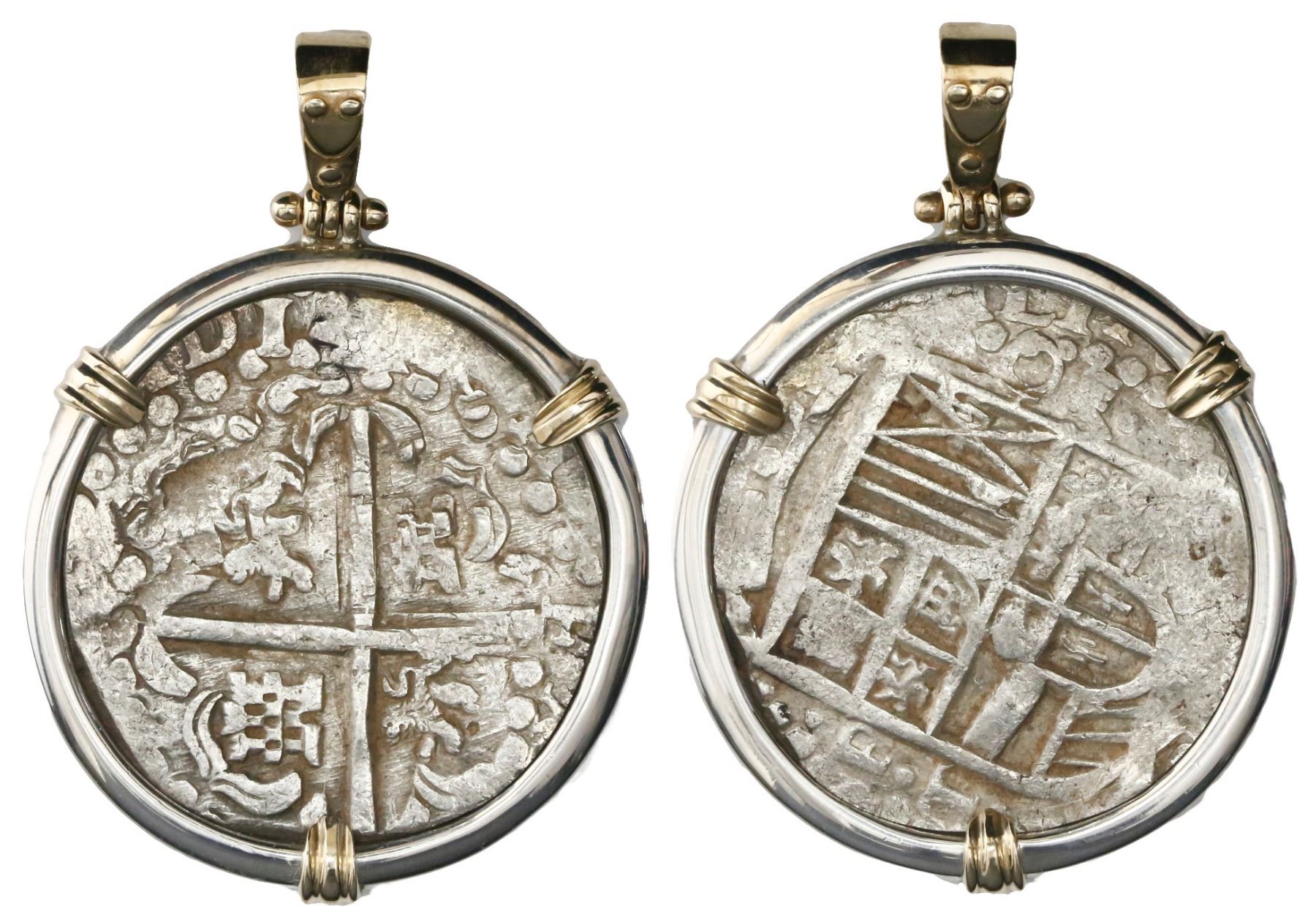 Potosi, Bolivia, cob 8 reales, Philip IV, assayer T (1629, heavy-dot borders, denomination o-VIII), ex-"Panama hoard" (ca. 1629), mounted cross-side out in silver bezel with 14K gold prongs and shackle bail. 38.33 grams total. Good full cross and shield, traces of orange sediment, nice XF, thick and heavy bezel. From the ca.-1629 "Panama hoard."