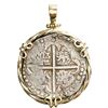 Potosi, Bolivia, cob 8 reales, Philip IV, assayer T (late 1620s), ex-Panama Hoard (ca. 1629), mounted cross-side out in twisted-wire 14K gold bezel with looped prongs and shackle bail. 39.55 grams total. Bold full cross and shield (both well centered), full denomination O-VIII, XF with some weak spots, traces of orange sediment in crevices.