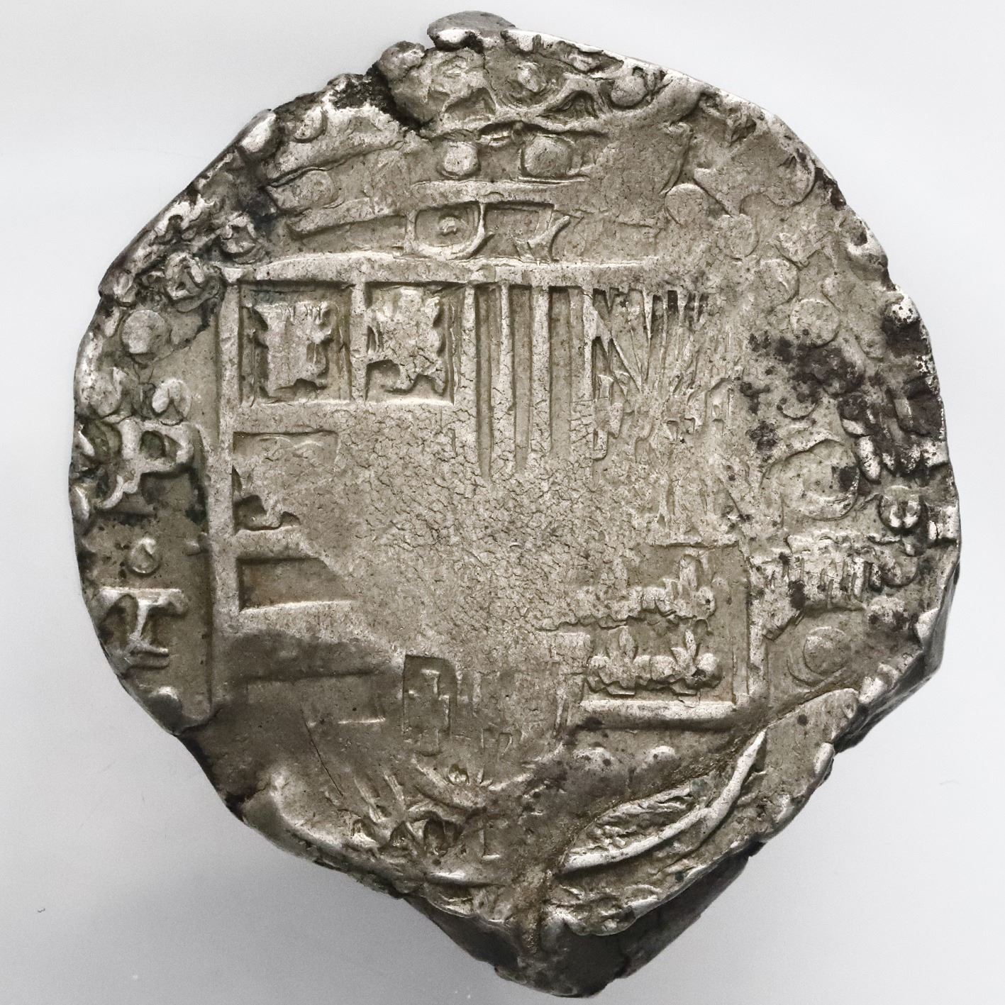 Potosi, Bolivia, cob 8 reales, Philip IV, assayer T (mid-1620s), quadrants of cross transposed.