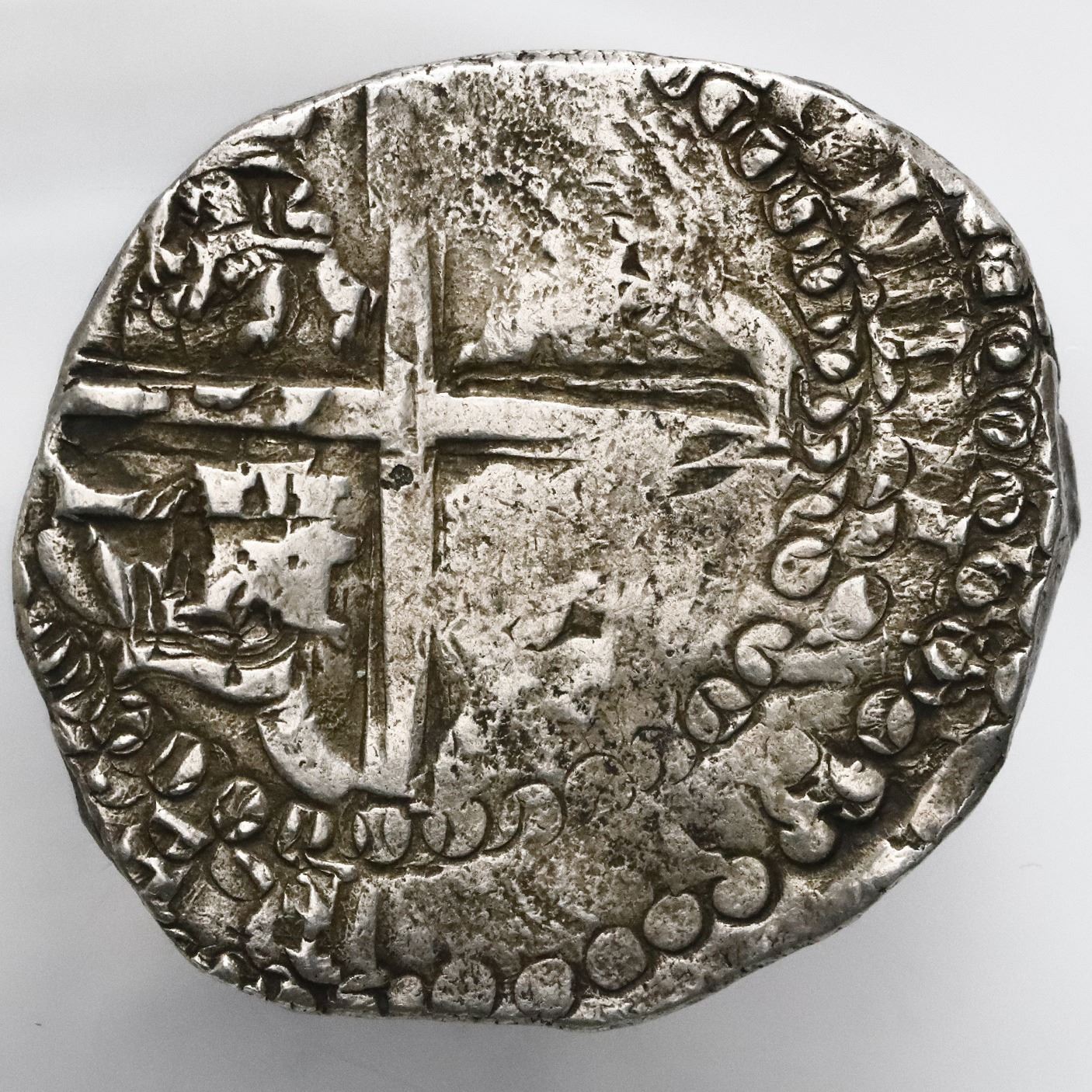 Potosi, Bolivia, cob 8 reales, Philip IV, assayer T (mid-1620s), quadrants of cross transposed.