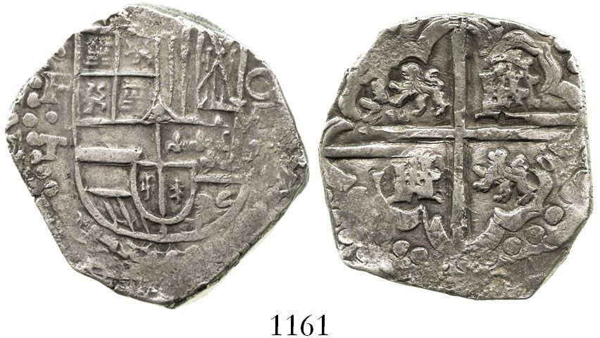 Potosi, Bolivia, cob 8 reales, Philip IV, assayer T (mid- to late 1620s), quadrants of cross transpo