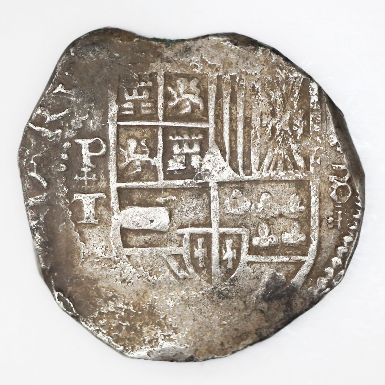 Potosi, Bolivia, cob 8 reales, Philip IV, assayer T with cross-fleury ornaments (ca. 1631).