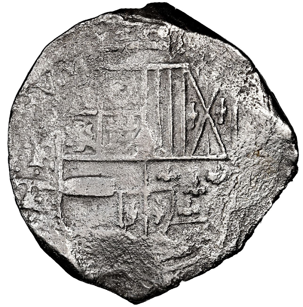 Potosi, Bolivia, cob 8 reales, Philip IV, assayer TR (mid- to late 1630s), NGC XF details / saltwater damage / Concepcion (Shipwreck Blue Label). S-P26; KM-19a. 25.19 grams. Non-toned and only lightly surface-corroded, with good full shield and full P-TR to left (note label says assayer T in error), good full cross. Pedigreed to the 45th Anniversary Collection, with original tag 17570 and official (generic) Letter of Authenticity. Recovered from: Concepcion, sunk in 1641 off Hispaniola