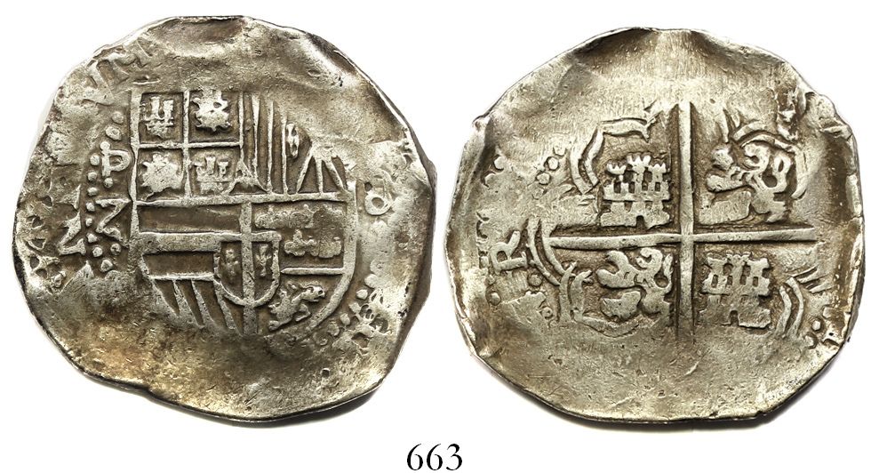Potosi, Bolivia, cob 8 reales, Philip IV, assayer Z, no countermark, rare. S-P34; KM-19a. 25.49 grams. Broad flan with choice full cross-lions-castles and shield, bold P-Z, flat peripheries, toned AXF, a coin with moderate rarity on three levels: for the assayer, for its lack of a countermark and for being non-salvage (also note the low weight, indicative of the scandal that broke just after this coin was issued).