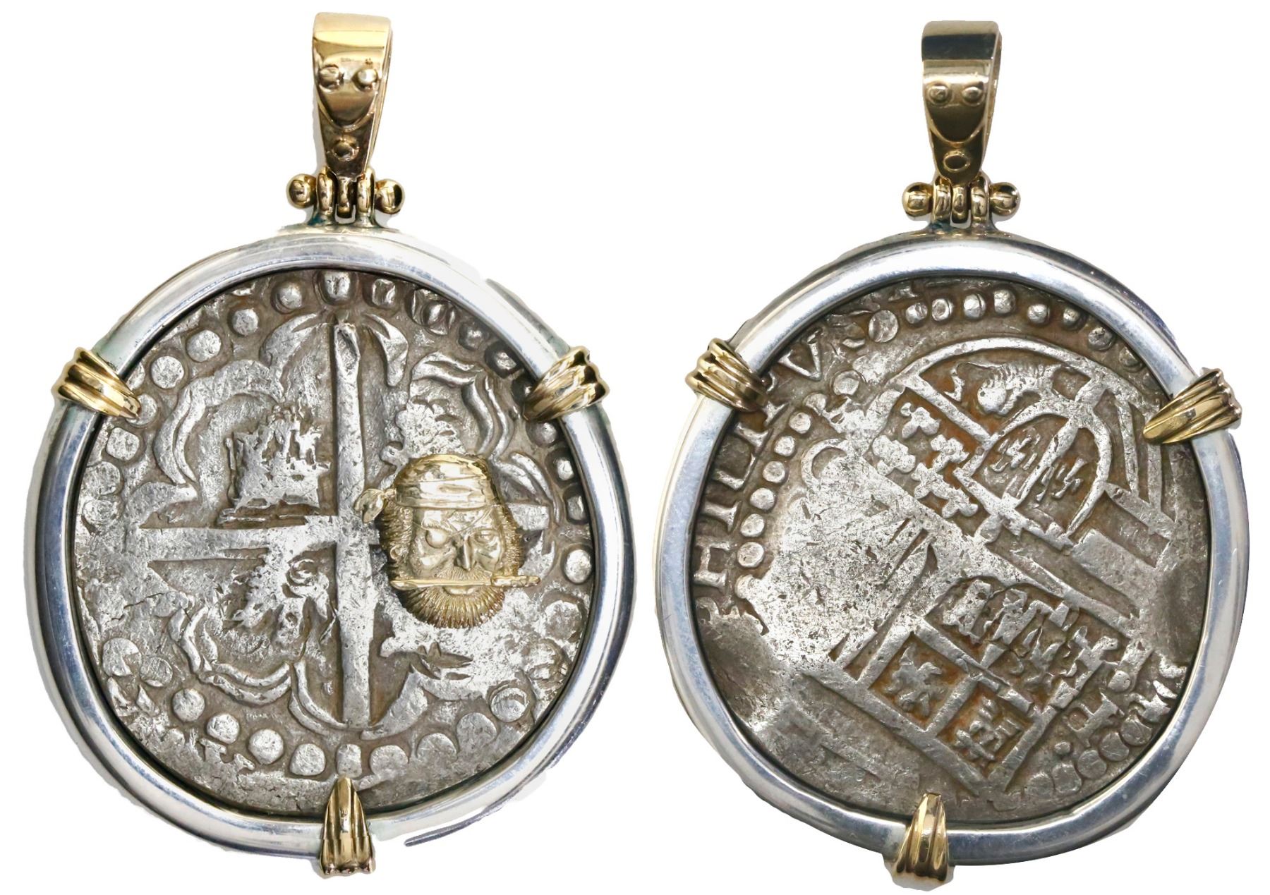 Potosi, Bolivia, cob 8 reales, Philip IV, assayer not visible, ex-"Panama hoard," mounted cross-side out in silver bezel with 14K gold prongs, pirate face embellishment and shackle bail. 37.67 grams total. Full cross with pirate embellishment to right, partial shield, red encrustation in recessed areas. From the ca.-1629 "Panama hoard," with photo-certificate.