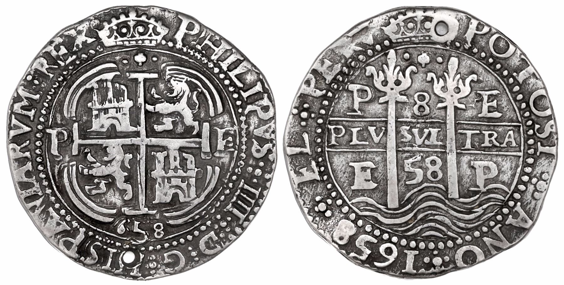 Potosi, Bolivia, cob 8 reales Royal, 1658E, pomegranate (with dots) at top on both sides.