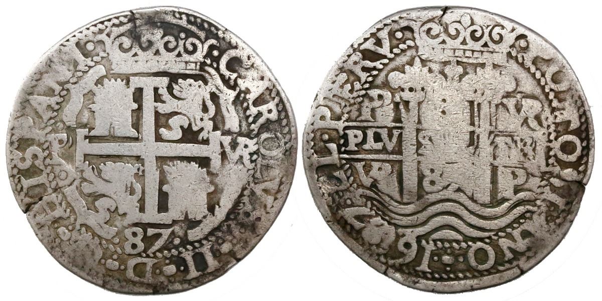Potosi, Bolivia, cob 8 reales Royal, 1687VR. S-P40; KM-R26; CT-325. 24.22 grams. Worn (VG) but with all details clear and amazingly unholed, toned on fields, two hairline edge-splits. Lazaro #220.