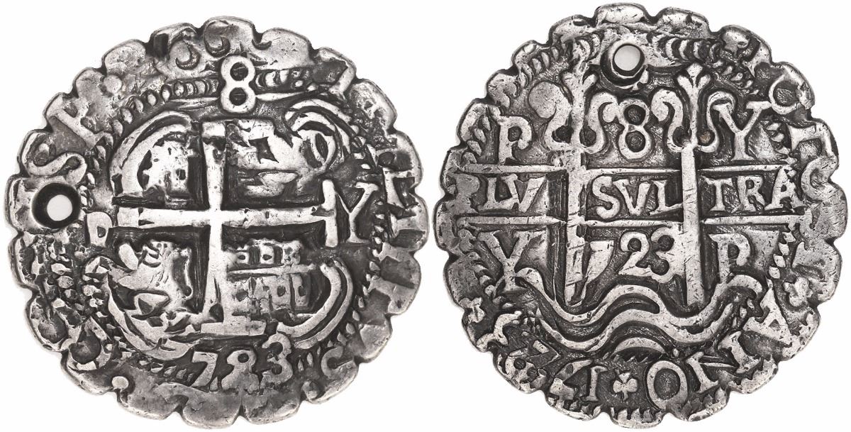 Potosi, Bolivia, cob 8 reales Royal, 1723Y, rare, serrated edge. 26.31 grams. This fascinating coin is unique among its type for the edge imparted in its time (reminiscent of the "denarius serratus" of Roman times), executed either to add attraction or to show it is solid silver (or both); but also it is unique as a Royal in that its cross side is an unknown die (the pillars side matches Lazaro #273), and it's a rare date to begin with, also quite a nice strike (much better than Lazaro's example) with full and bold details all over enhanced by toning on fields, XF overall, with inevitable hole at top of pillars / left of cross (axes aligned by 90 degrees).