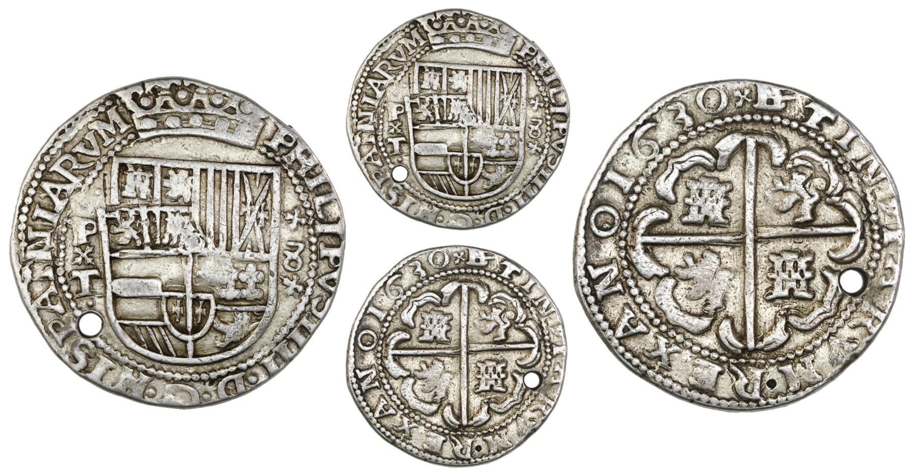 Potosi, Bolivia, cob 8 reales Royal (galano), 1630T, x-shaped ornaments, very rare first known date of Potosi Royals, Lazaro Plate Coin. S-P26; KM-R19a; CT-388. 26.60 grams. A truly grand piece of art, with all details full and bold on a very broad, round, even flan, in blatant contrast to the regular issues even for this typically choice date. Curiously, there are fleury-cross ornaments (which Paoletti refers to as St. Andrews crosses) between the P and T and above and below the denomination 8, which began late in this year and ceased (at least as x's) in 1631, distinguishing this issue from other 1630 Royal 8R without those ornaments (also differentiated by the recumbent position of the 6 in the date on our specimen). A small punch-mark can be seen below the cross, with a neatly drilled hole below the assayer, grading XF with toning around details and traces of gilding. This jewel of a coin is shown as just a rubbing in Lazaro, who gave it a rating of RX (<3 known), and was recently featured in the Cayon auction of January 2018 (lot 5022) with a long article (translated into English by Herman Blanton and published in NI Bulletin, Vol. 53, No. 9/10, September/October 2018) concerning the origin of cob coinage at Potosi and the genesis of "Royal" coinage. As is well known by now, the term "Royal" is a misnomer, as there is no evidence that these coins were struck for the King, and a term found in contemporary documents--galano--appears to refer to these special issues as well as Hearts. What is still unknown, however, is why these coins were made, and why they were made in differing quantities at apparently random times in certain years. The first Royals were made in Mexico just before the year 1600; the 1630 Royals of Potosi, like this one, were the first to be struck at Potosi and in fact in all of South America.