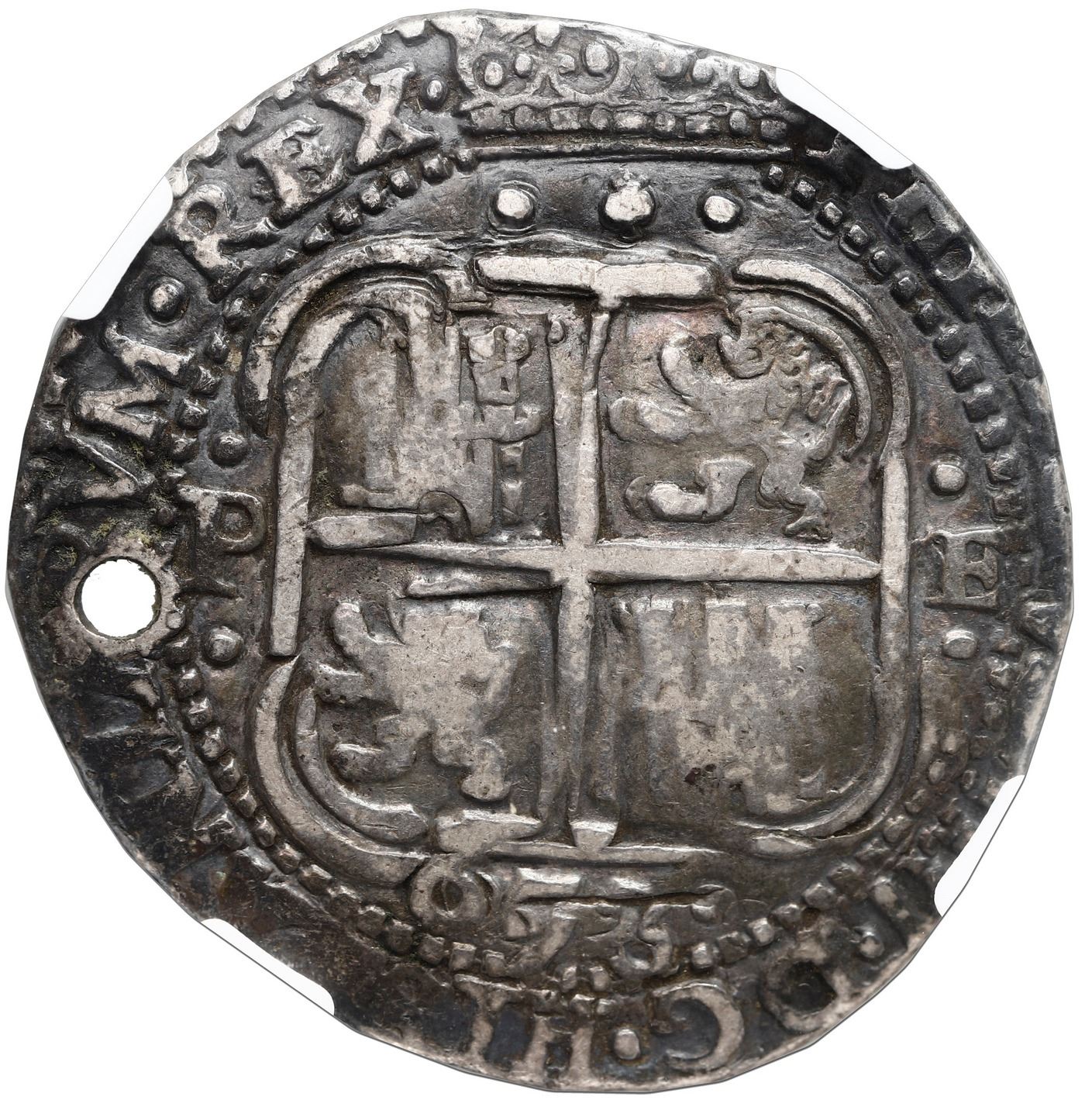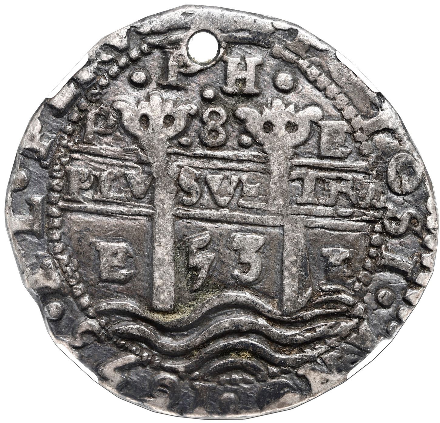 Potosi, Bolivia, cob 8 reales Royal (galano), 1653 E, dot-PH-dot at top, NGC VF details / holed. S-P37a; KM-R21; Cal-1412. 26.07 grams. Fairly broad flan with nearly full legends (bold full date) and choice inner details (minimal doubling), all with a very rich old toning, neatly holed at the top of the pillars / right of the cross, scare-to-rare date but these dies not listed by Lazaro (three dots around the denomination between pillar-tops, dot-pomegranate-dot above and date in three digits below cross, etc.).