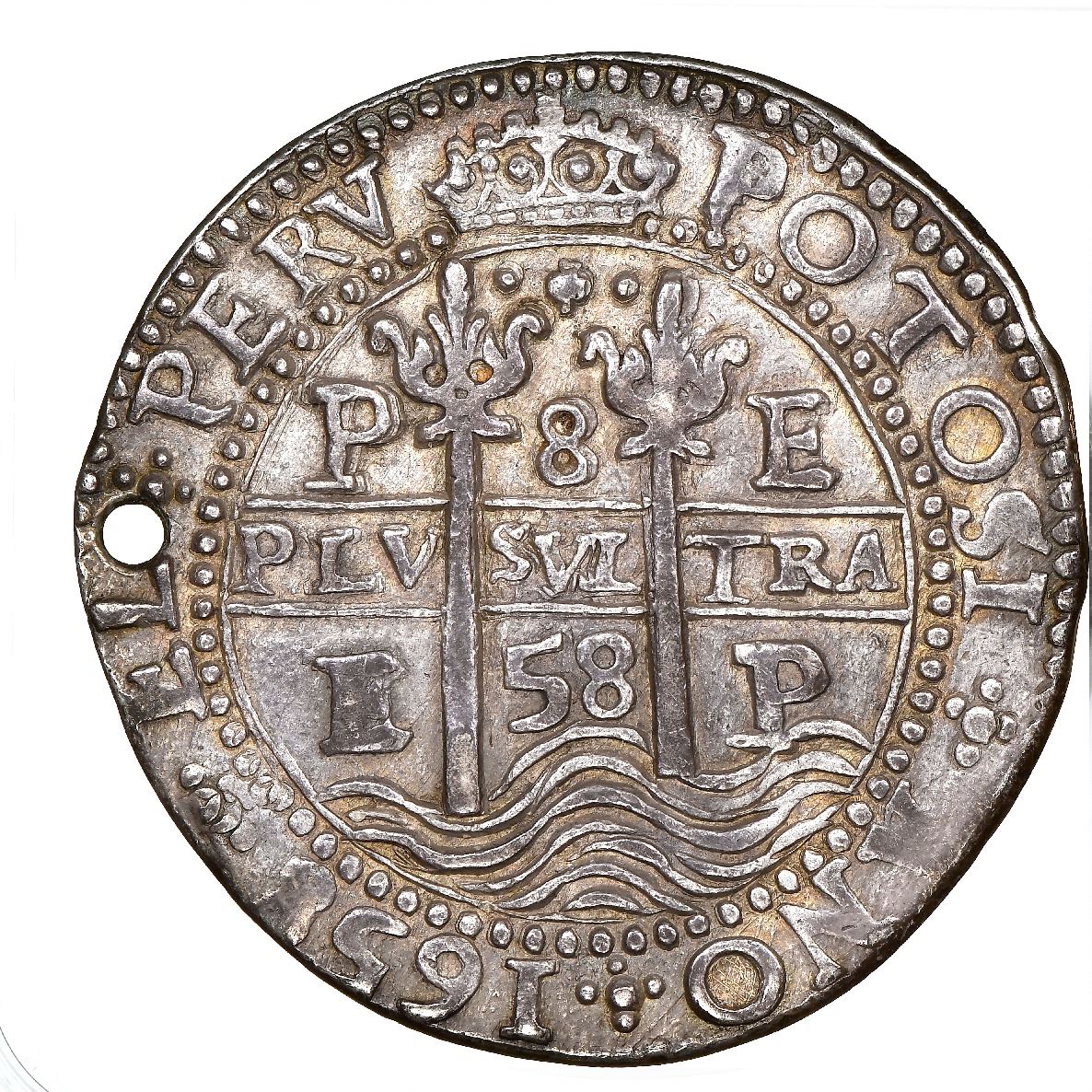 Potosi, Bolivia, cob 8 reales Royal (galano), 1658E, dot-pomegranate-dot at top on both sides, NGC A