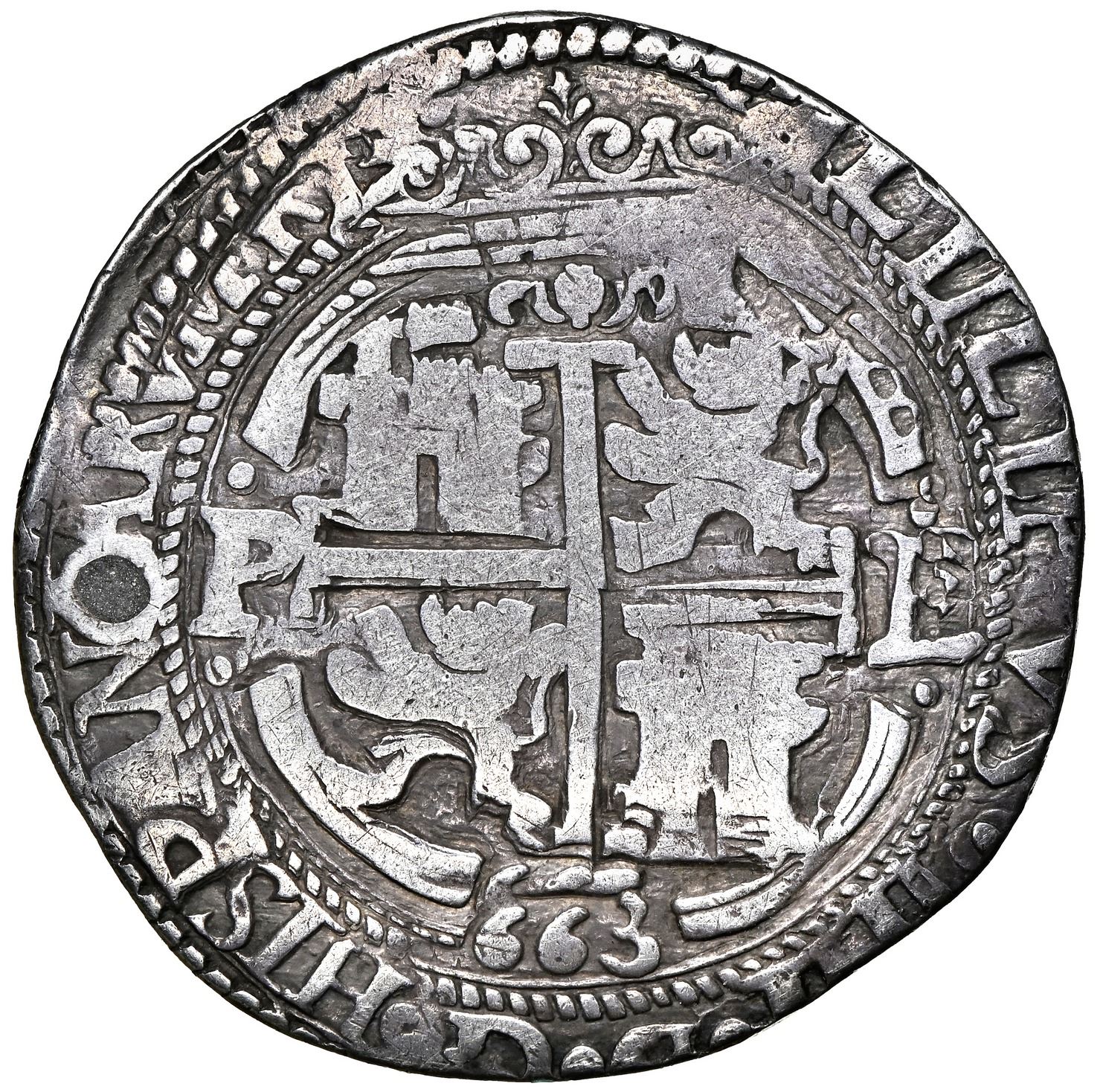 Potosi, Bolivia, cob 8 reales Royal (galano), 1663 E, rare, NGC plugged, clipped, ex-Tempel. S-P37a; KM-R21; Cal-1431. 24.66 grams. Broad flan (despite stated clipping) with nearly full legends and full inner details despite flatness and minor doubling, die match with Lazaro 169 (rarity R2, the only known Royal dies for this generally scarce date), attractively toned, plugged hole at top of pillars / left of cross. NGC #6272087-006. Pedigreed to the Tempel Collection (stated on label).