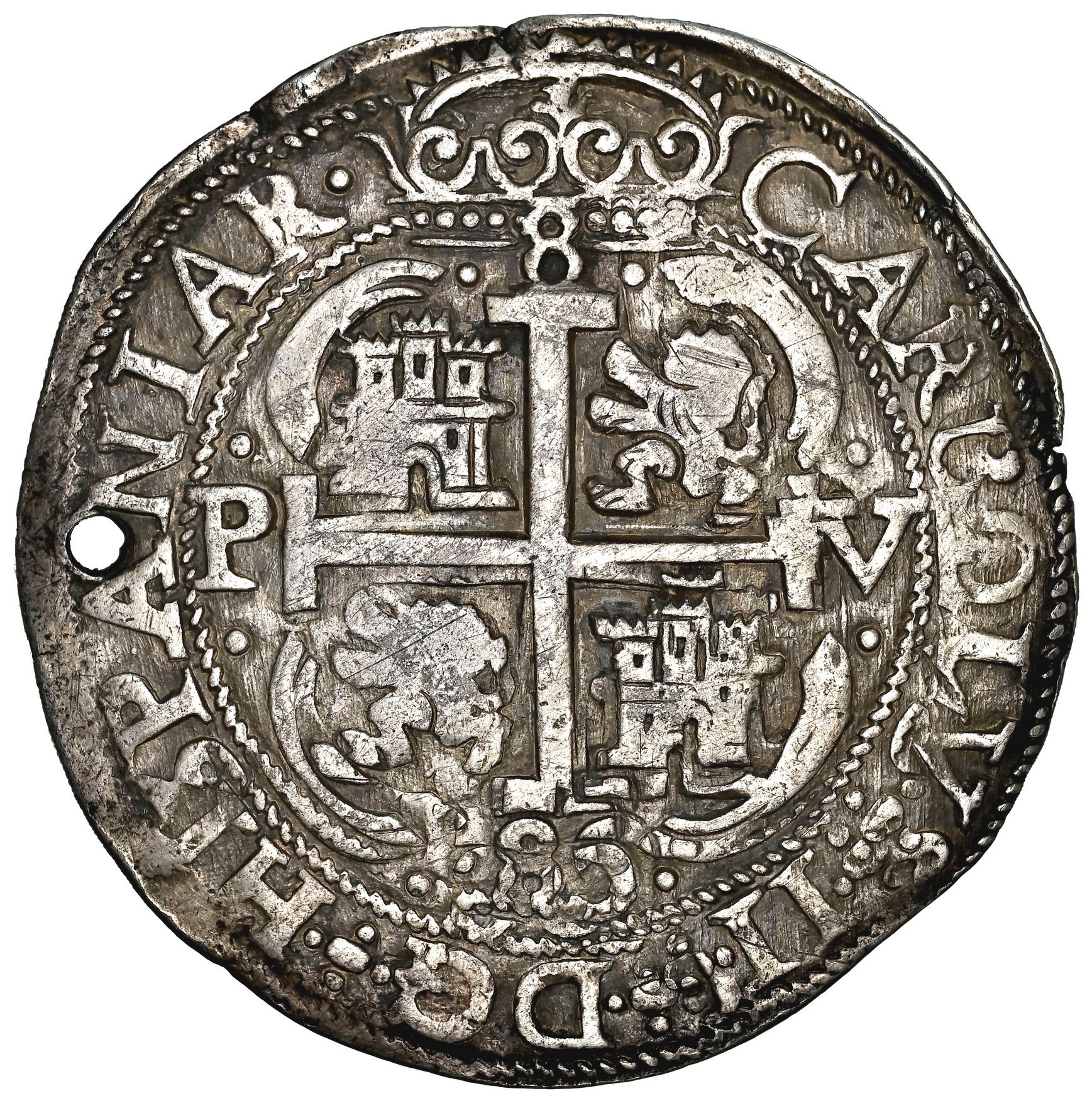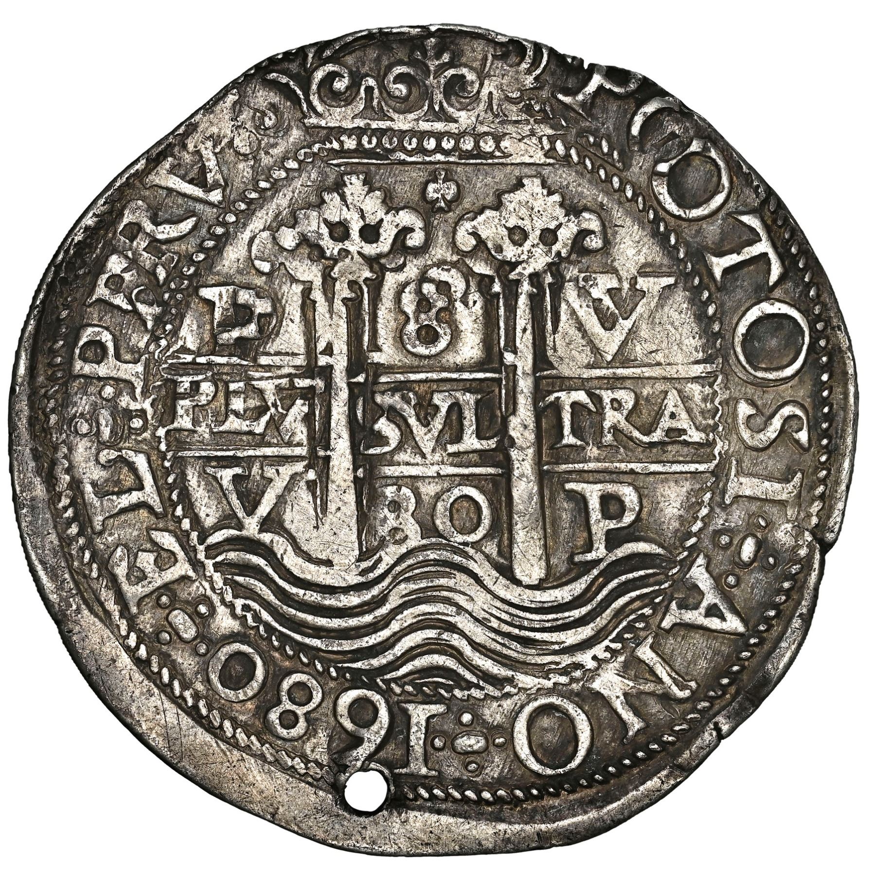 Potosi, Bolivia, cob 8 reales Royal (galano), 1680 V, pomegranate at top of pillars, NGC AU details / holed, finest and only example in NGC census. S-P39; KM-R26; Cal-676. 26.54 grams. Impressively broad flan extending well past outer borders in places, all details full as a result, also with practically no doubling or weakness, die-match with Lazaro 202, richly toned, holed to left of cross / bottom of pillars.