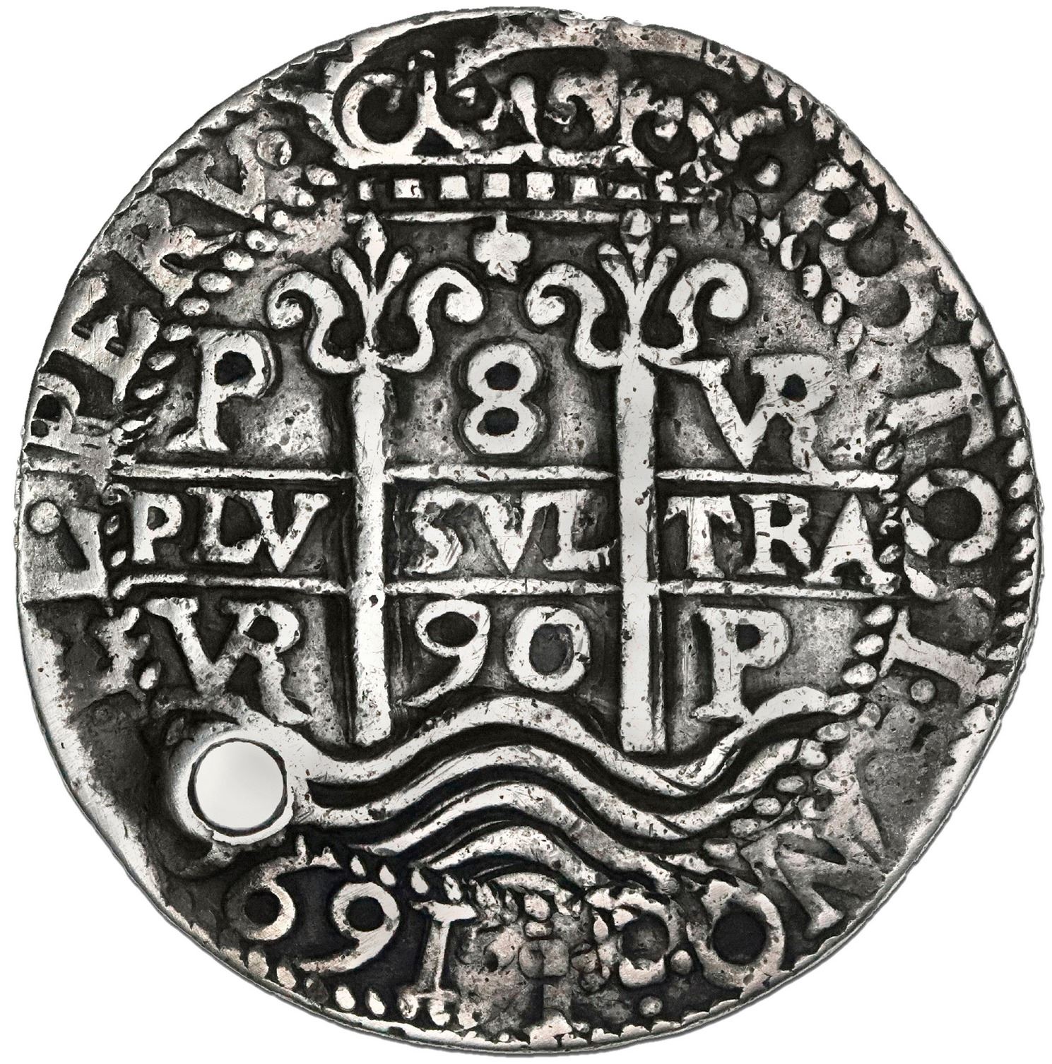 Potosi, Bolivia, cob 8 reales Royal (galano), 1690 VR, rare, NGC XF details / holed. S-P40; KM-R26; Cal-686. 26.19 grams. Broad flan with full legends and choice inner details enhanced by contrasting toning, no doubling, crudely holed to left of cross / about 7 o'clock on pillars side, old scratches on lions and castles, cross side die matches Lazaro 228 (rarity R3) but pillars side appears to be an unrecorded die, one of three at this grade at NGC with none higher. NGC #5940510-005.