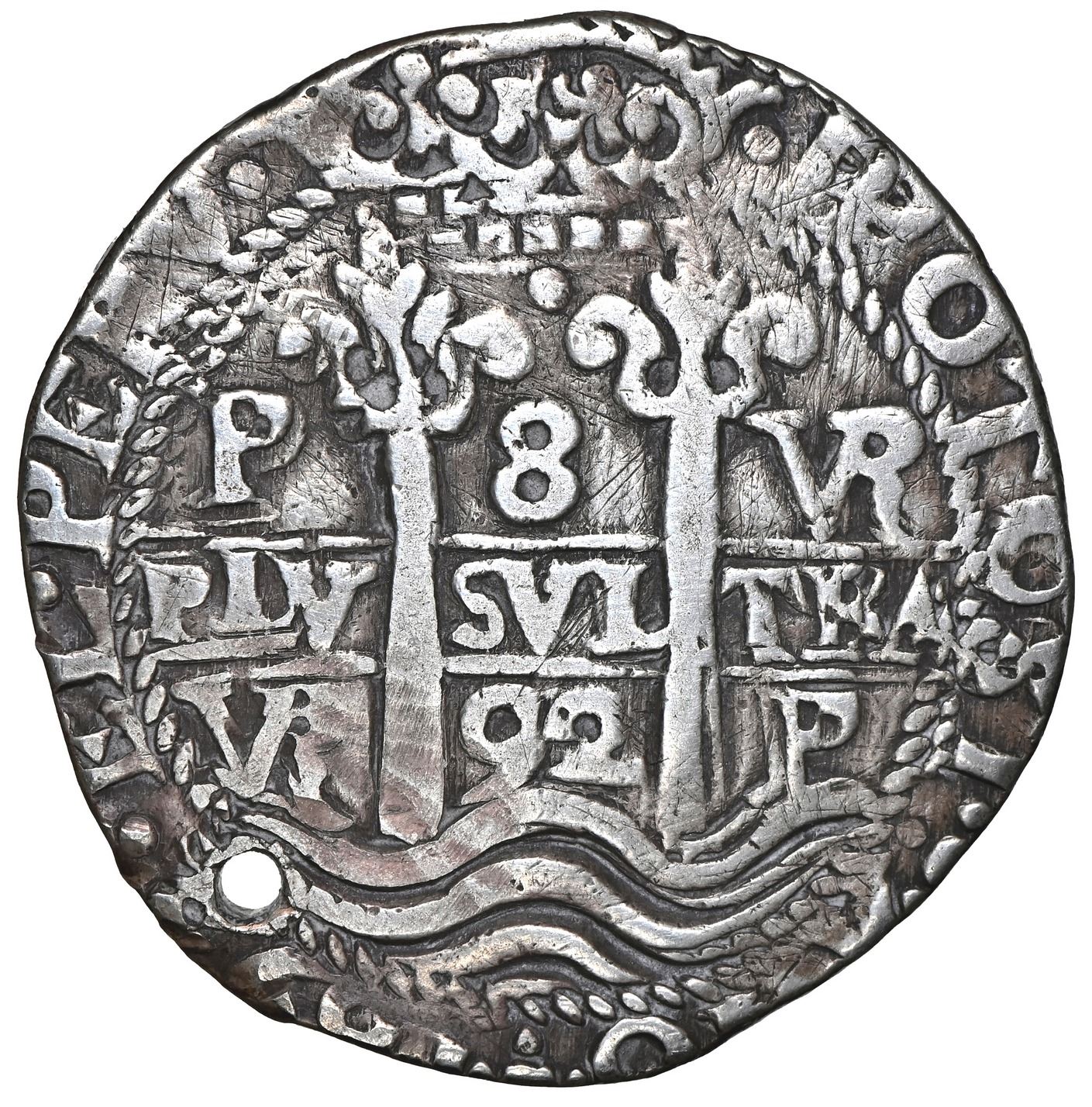 Potosi, Bolivia, cob 8 reales Royal (galano), 1692 VR, rare, NGC VF details / holed, ex-Tempel.