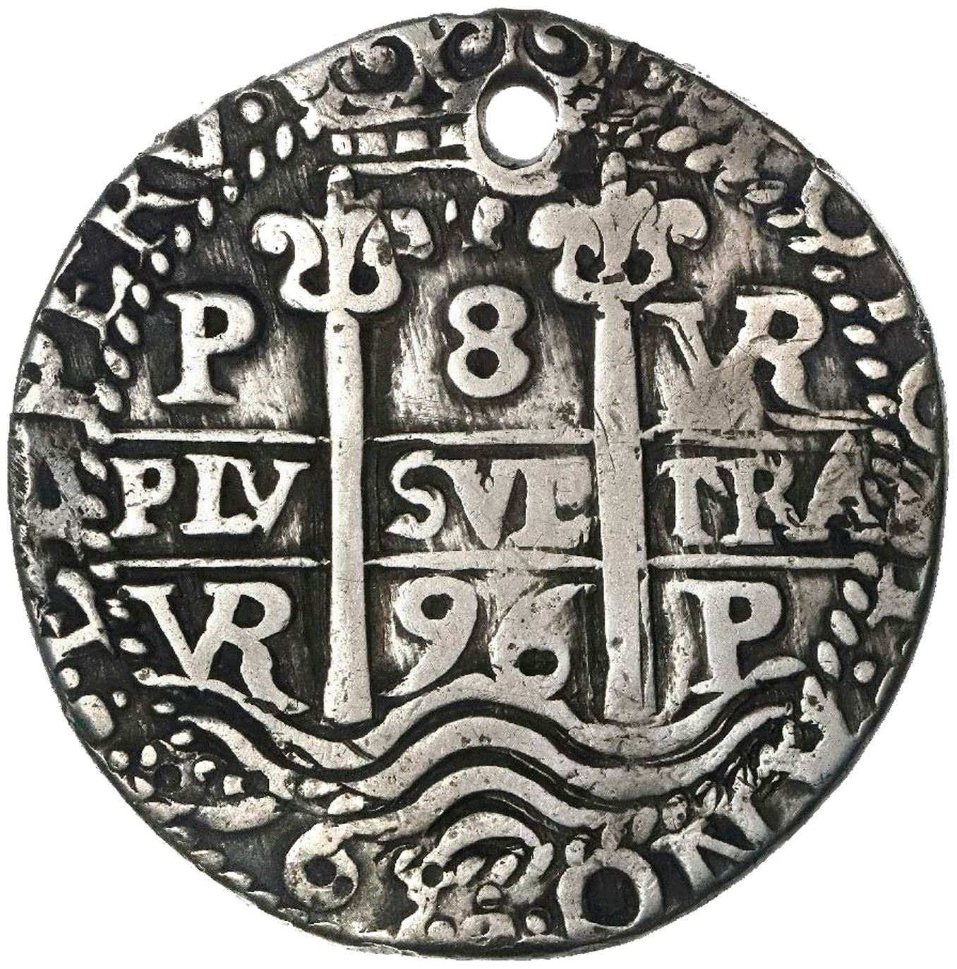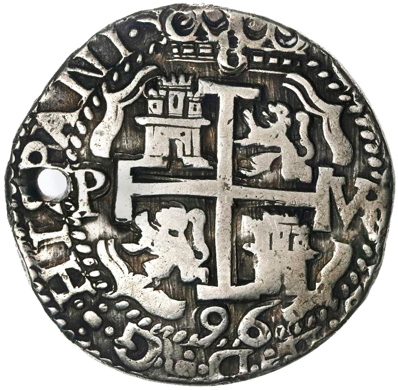 Potosi, Bolivia, cob 8 reales Royal (galano), 1696 VR, rare, NGC VF details / holed. S-P40; KM-R26; Cal-692. 26.64 grams. Nearly full legends and choice full inner details (no doubling, cross side off-center), with lovely toning all over, typical hole at top of pillars / left of cross, die match with Lazaro 235 (rarity R2), tied with one other for finest in NGC census. NGC #5940510-006.