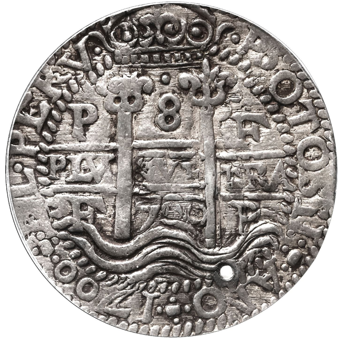 Potosi, Bolivia, cob 8 reales Royal (galano), 1700 F, rare, PCGS XF details / holed, finest and only example in PCGS census. S-P42; KM-R26; Cal-696. 26.35 grams. Atypically broad flan with 100% full details, low-contrast toning with traces of encrustation in crevices, small hole below right pillar / left of cross, die-match with Lazaro 238 (rated R4).
