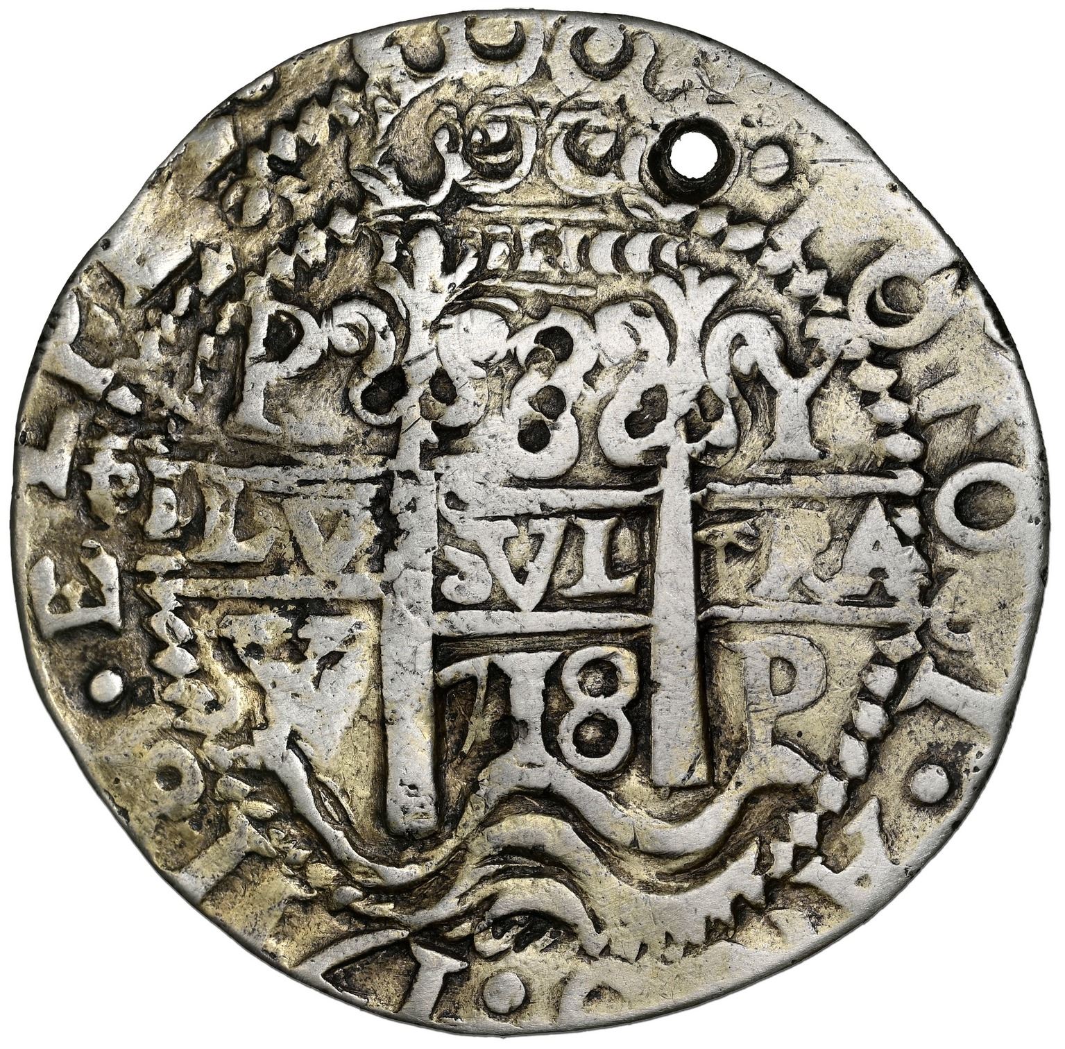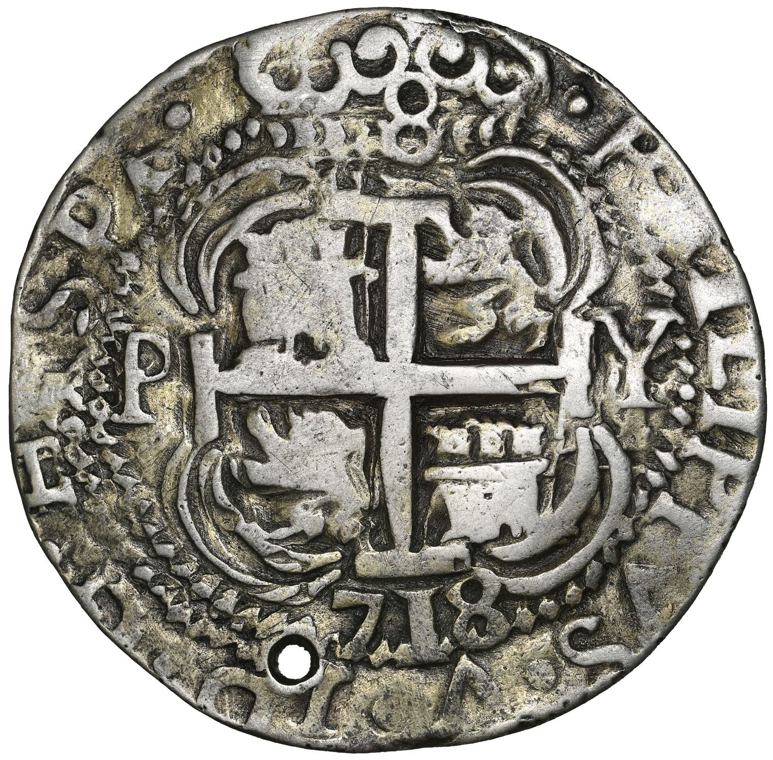 Potosi, Bolivia, cob 8 reales Royal (galano), 1718 Y, dots in legend, very rare, NGC Genuine / holed
