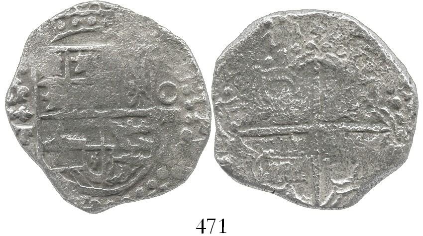 Potosi, Bolivia, cob 8 reales, date as "2621" (rare), assayer T, quadrants of cross transposed, Grade-2 quality but Grade 1 on certificate. S-P21; KM-10. 24.0 grams. Bold P+T (tiny letters), full but lightly corroded shield, full but moderately corroded cross, the date partially weak but certain (bold 2's) and clearly not doubled. From the Atocha, sunk in 1622 west of Key West, Florida, with original Fisher certificate #182793.