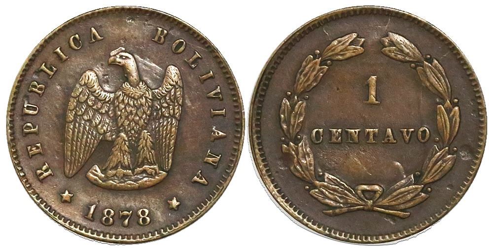 Potosi, Bolivia, copper 1 centavo, 1878. KM-162. 2.98 grams. Chocolate brown-toned AU/UNC with scratch on reverse through O, small planchet flaws and die clash marks (typical for the issue), rare one-year type seldom offered at auction.