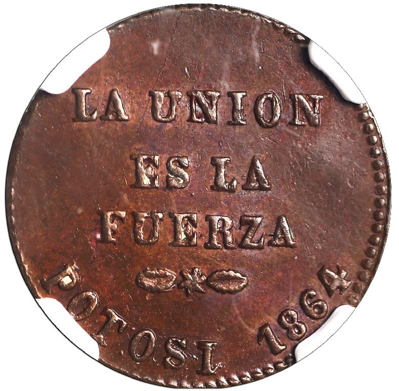Potosi, Bolivia, copper 1 centecimo (centesimo), 1864, NGC MS 64 Brown, finest known in NGC census, ex-Lissner. KM-147. Bold strike except for parts of rims (slightly off-center strike), even reddish-brown color with traces of rainbow colors over luster when viewed at an angle, still the finest graded after almost a decade since Lissner. Pedigreed to the R.L. Lissner Collection (stated on label, St. James's / CNG / Teller auction of August 2014, lot 1227). Please use this link to verify the certification number