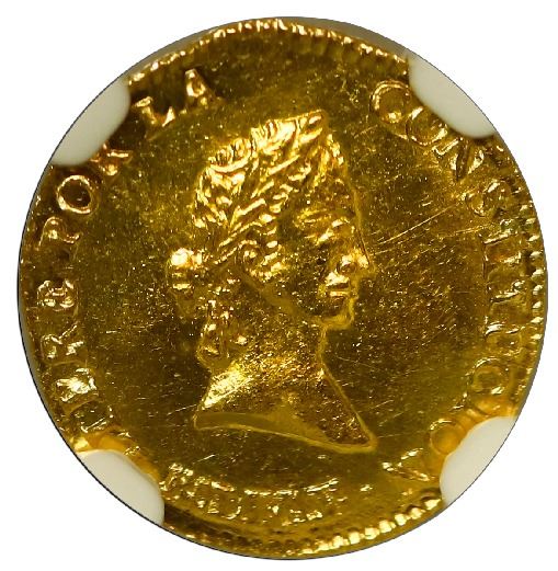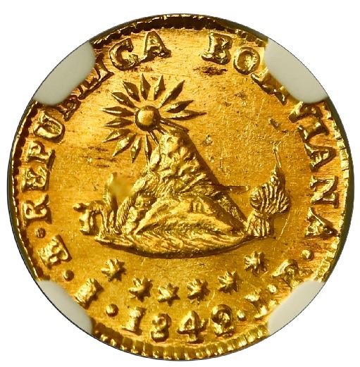 Potosi, Bolivia, gold 1/2 scudo, 1842 LR, NGC MS 64 ("top pop"). KM-104; Fr-30. Superb luster on satin-smooth fields contrasting with very bold details (almost prooflike), a gem of a coin by any measure, tied with one other for finest in the NGC census.