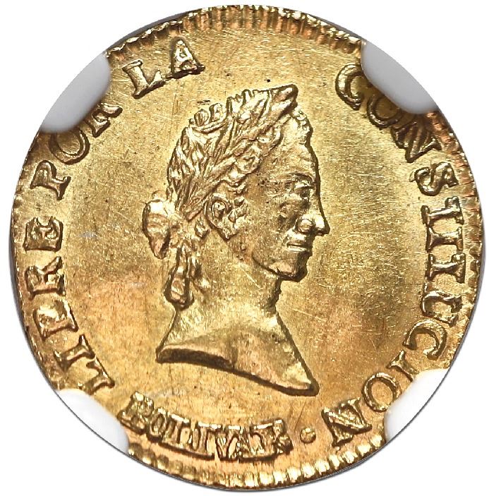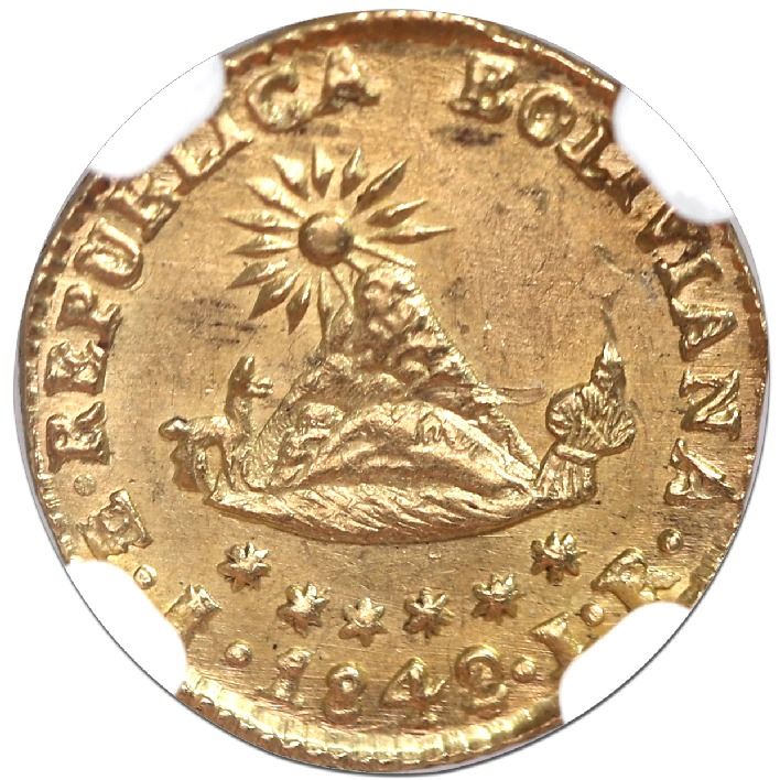 Potosi, Bolivia, gold 1/2 scudo, 1842LR, NGC MS 63, ex-Flores. KM-104. Choice bold strike with slightly crude rims (as made), strong luster and bright yellow color, faint flan-bulge on obverse, second finest in NGC census behind a single MS 64. NGC #3635723-007. Pedigreed to the Luis Flores collection (stated on label).