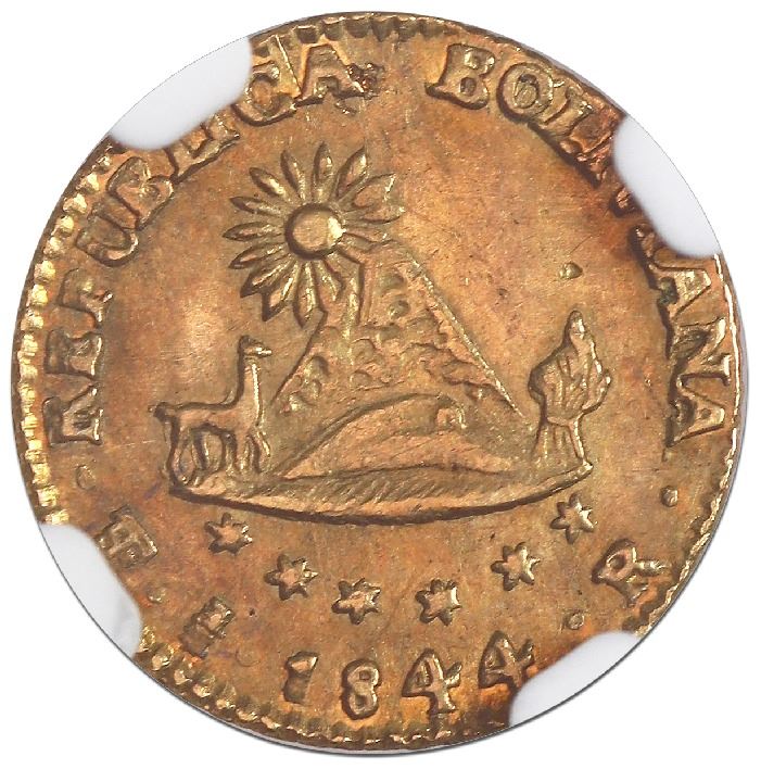 Potosi, Bolivia, gold 1/2 scudo, 1844R, medal axis, NGC AU 55, ex-Newman. KM-104. Light red toning and muted luster, bold full strike, desirable pedigree. NGC #2039321-039. Pedigreed to the Eric P. Newman collection (stated on special label).