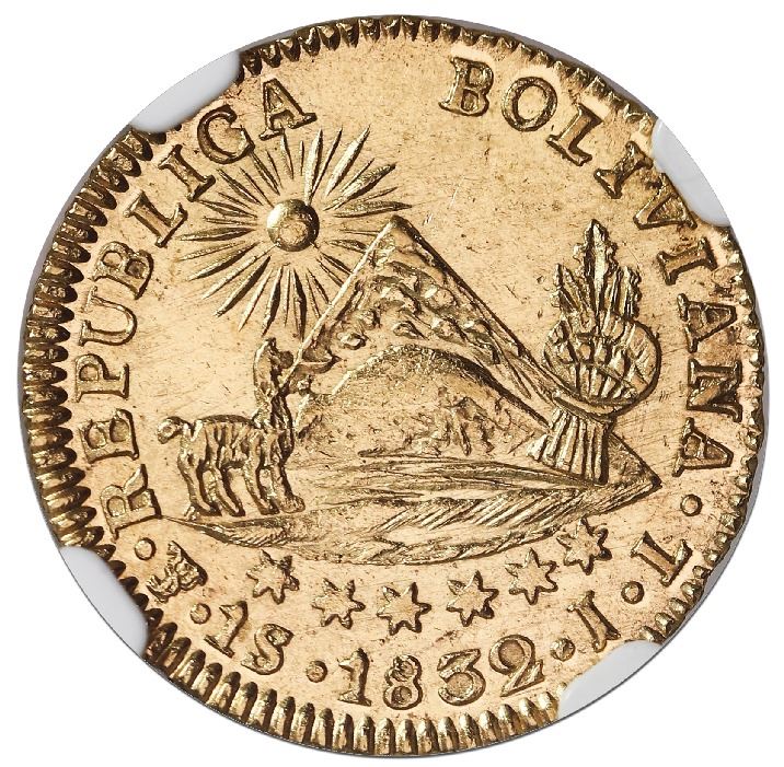 Potosi, Bolivia, gold 1 scudo, 1832JL, NGC MS 62. KM-98. Brilliant luster and very choice strike with full details, faint surface hairlines, second finest in NGC census behind a single MS 63. NGC #3735724-014.