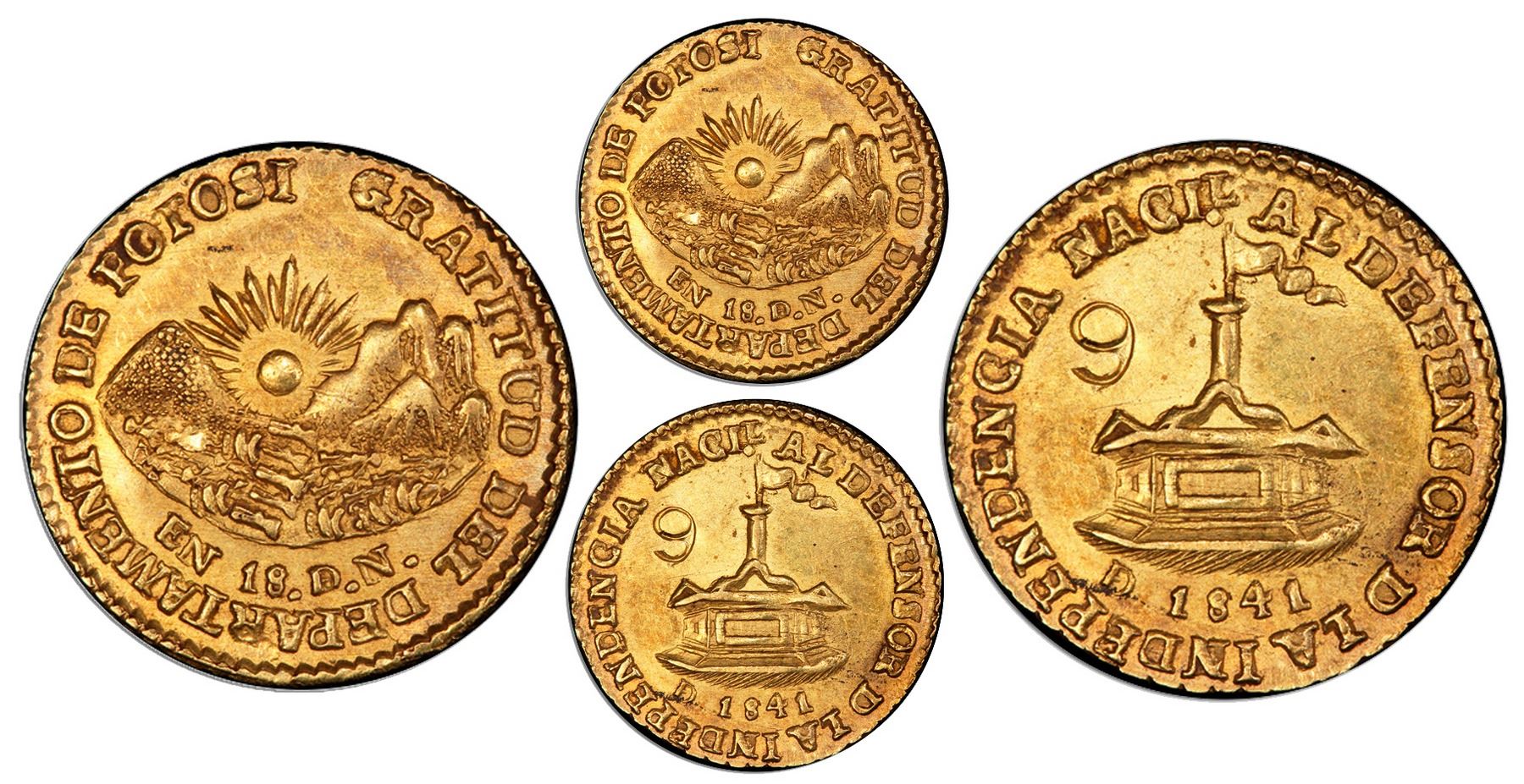 Potosi, Bolivia, gold 1 scudo, 1841, National Independence / Ingavi, PCGS AU details / damage. Burnett-19; Fonrobert-9796. Obverse with radiant sun over mountains and battlefield above EN 18. D.N. within legend GRATITUD DEL DEPARTAMENTO DE POTOSI; reverse with flag-topped monument above DE 1841 within legend AL DEFENSOR D LA INDEPENDENCIA NACIL; diagonally reeded edge. Bold strike with muted luster, no wear, clean fields but with "9" punched into obverse field. Slab label calls it unlisted in error. PCGS #32917090. The Whittier Collection of Bolivian Monetary Medals