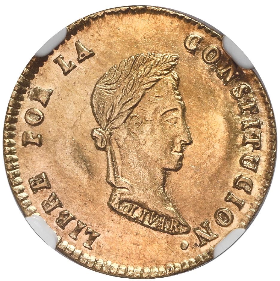 Potosi, Bolivia, gold 1 scudo, 1853MJ, NGC MS 62. KM-114. Broad flan with bold but incomplete rims, choice details and decent luster, faint surface hairlines, minor flan-bulges in obverse fields, second highest grade in NGC census for this date. NGC #3735712-010.