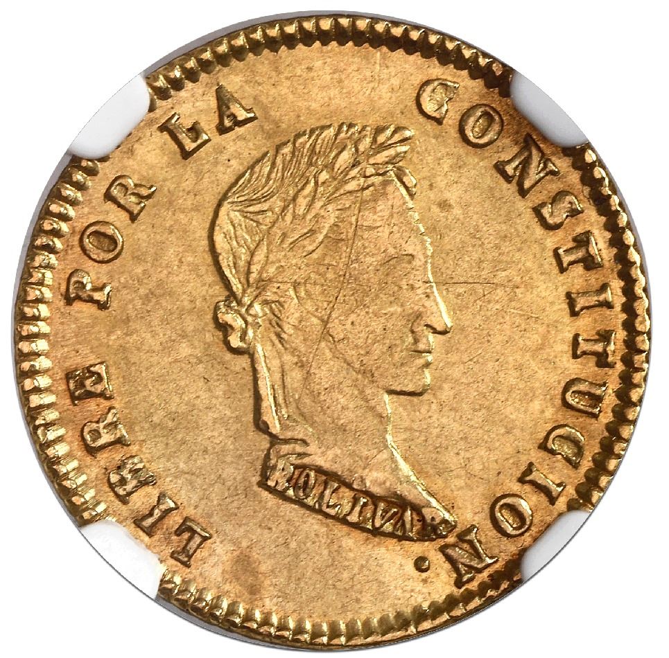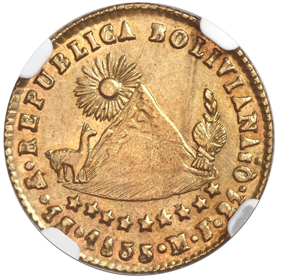 Potosi, Bolivia, gold 1 scudo, 1855MJ, NGC AU 55, ex-Newman. KM-114. Full rims and details, satin smooth fields (somewhat matte), minimal wear but a few old marks on bust, desirable pedigree. There appears to be some confusion about the assayer on the 1855 1 scudo, as it is clearly MJ but KM erroneously has it as LM/J and NGC adopted that convention for their census (which, as a result, omits the present coin). NGC #2039208-047. Pedigreed to the Eric P. Newman collection (stated on special label).