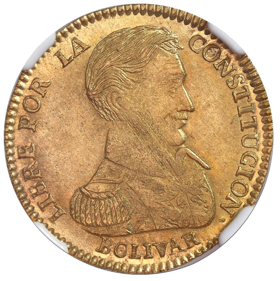 Potosi, Bolivia, gold 2 scudos, 1834LM, rare, NGC MS 63, ex-Newman. KM-101. Well-detailed and well-centered strike, good luster, light adjustment marks, choice specimen of a rare two-year type, tied with three others for second finest in NGC census behind a single MS 64, desirable pedigree. NGC #2039208-037. Pedigreed to the Eric P. Newman collection (stated on special label).